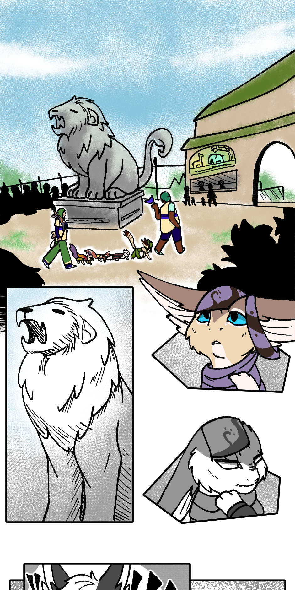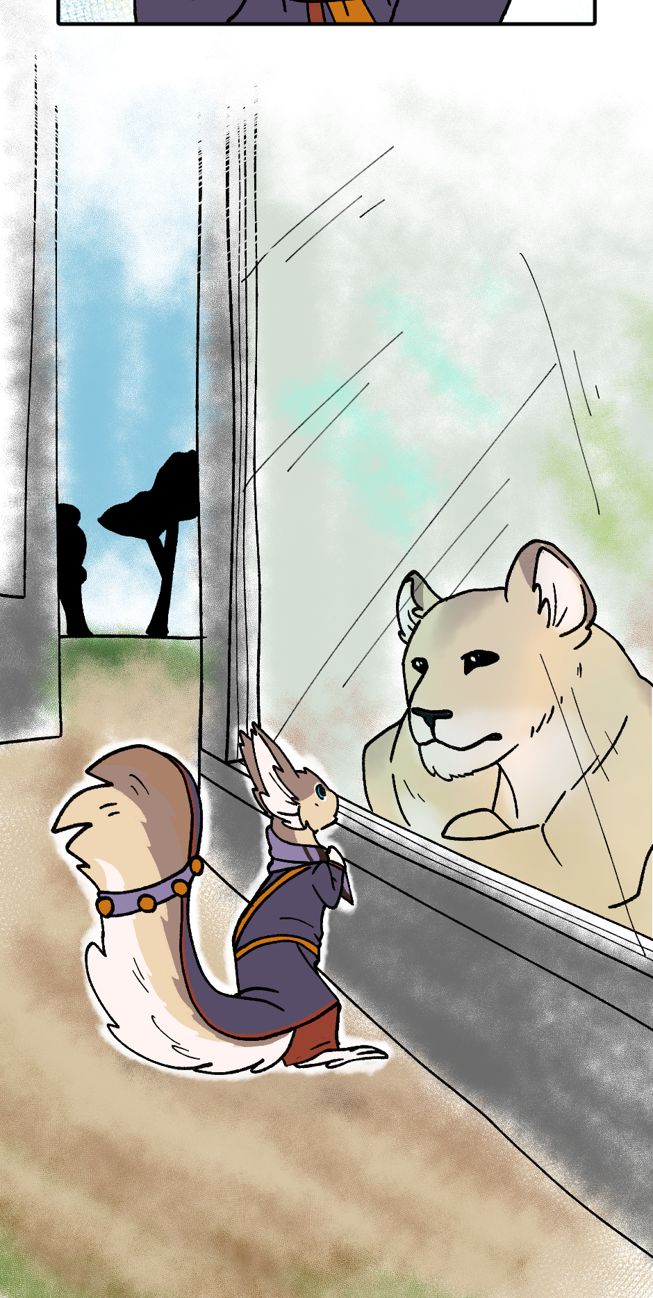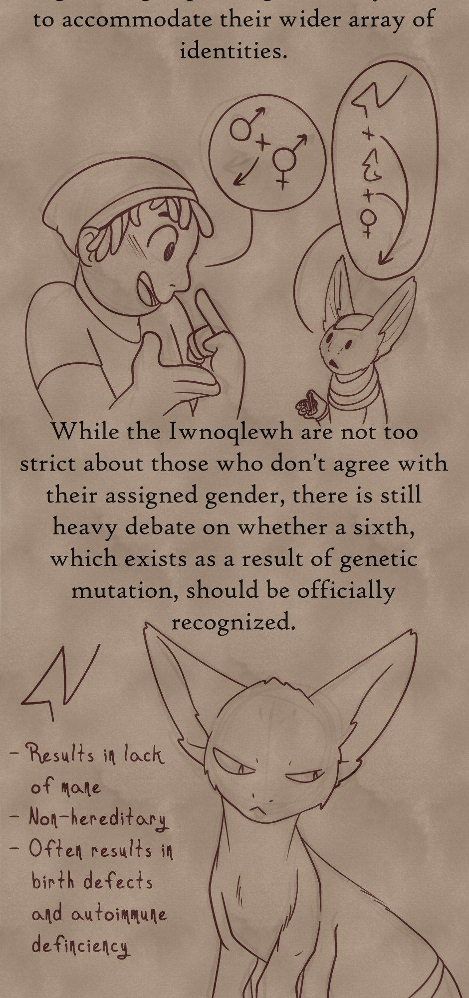 The Iwnoqlewh are both fascinated, confused, and sometimes slightly disturbed by some of Earth's wildlife. It can sometimes be kind of uncanny to see a creature that looks a bit like you, but Tanwi (Tahn-vi), the disabled, maneless Kimaj'jwd, definitely can appreciate Earth's lionesses. Manes are a big part of gender expression for them, while manelessness is a result of a somewhat rare genetic disorder, so seeing that a different species that either has manes or /no manes at all/ helps her feel a little more secure. Also, we'll definitely be seeing more of her and her best friend in the future.