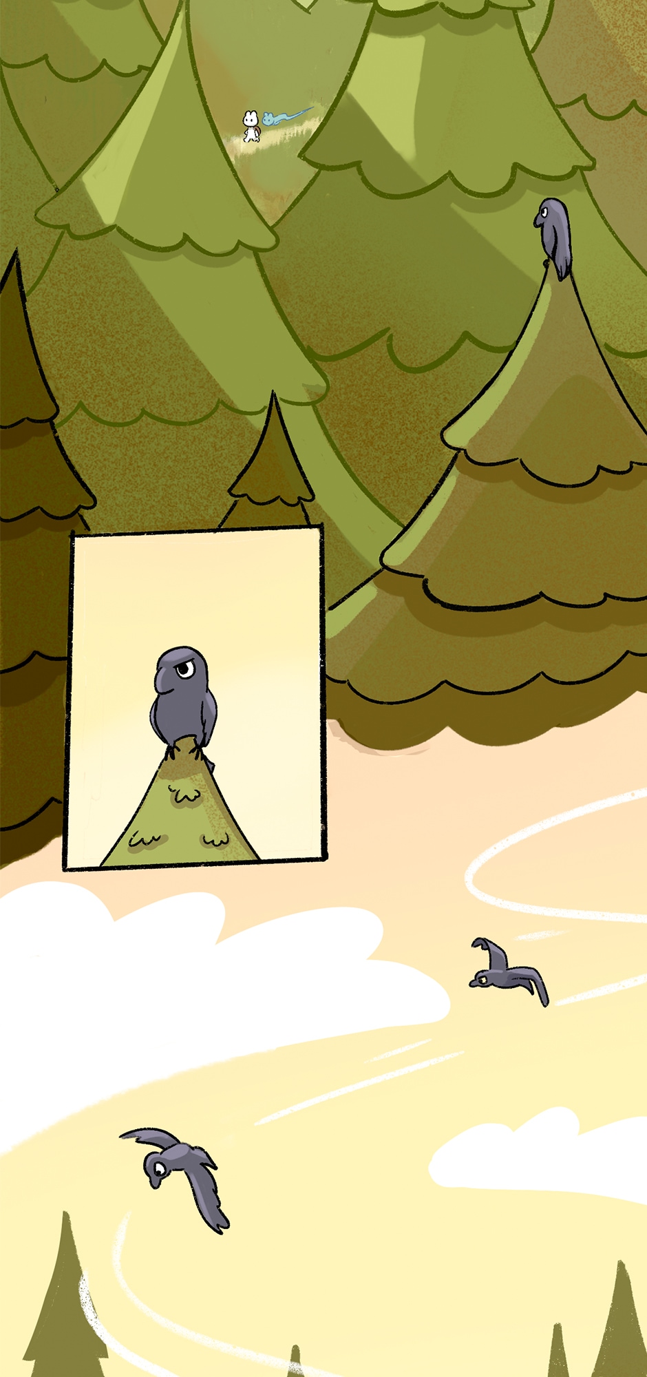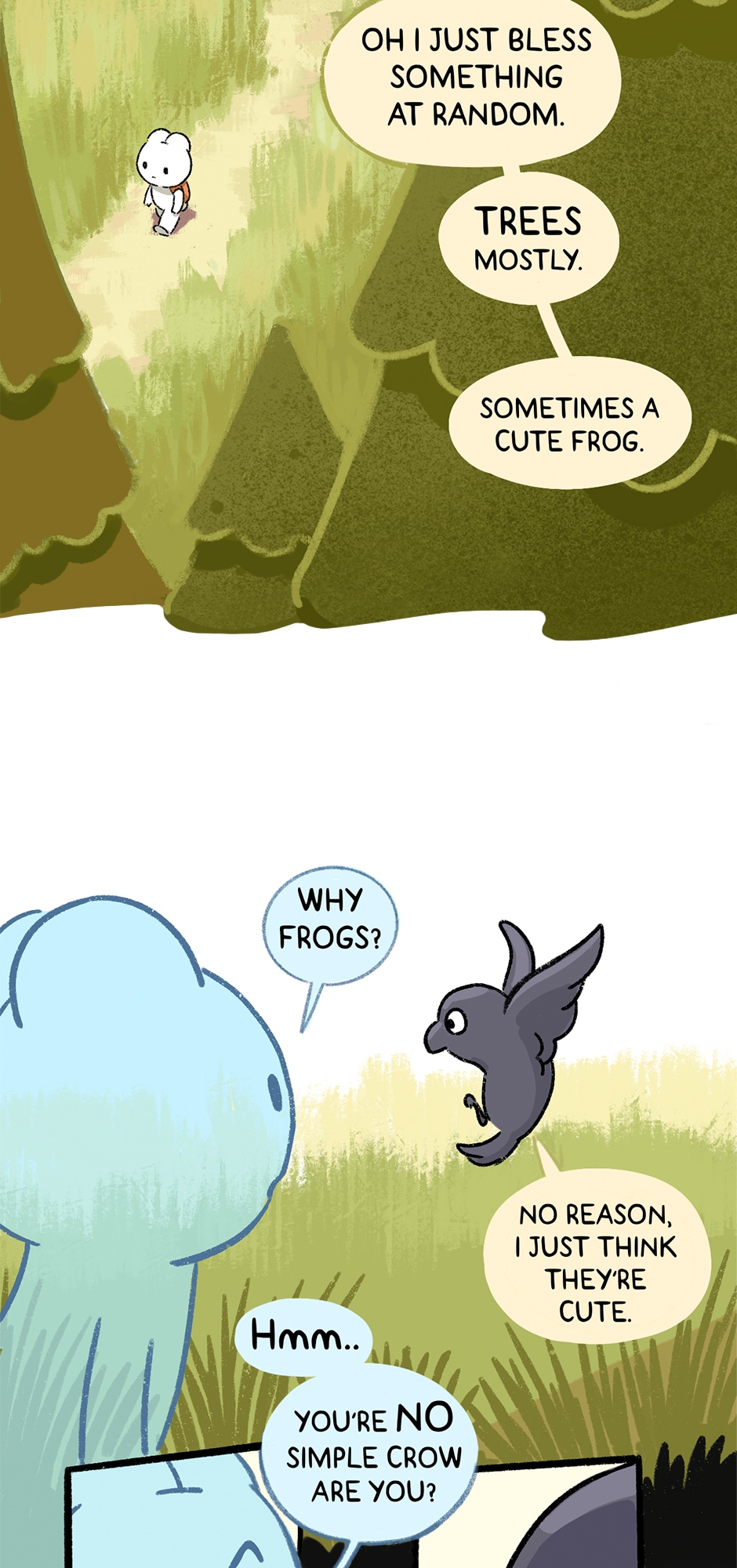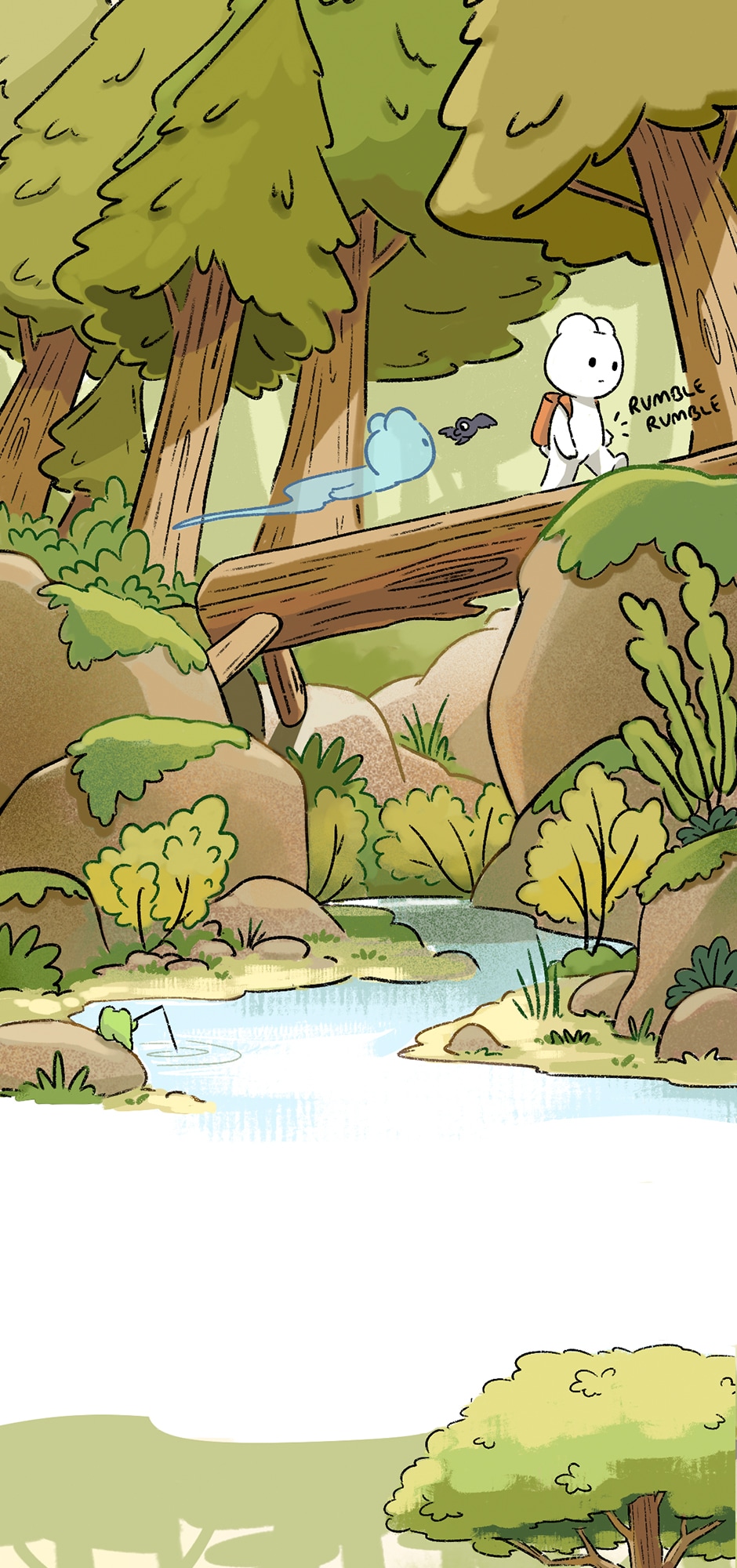 I like that picture of them crossing the wooden bridge. I like the trees and the water, and the little frog fishing. I agree with the crow. Frogs are cute. 🐸