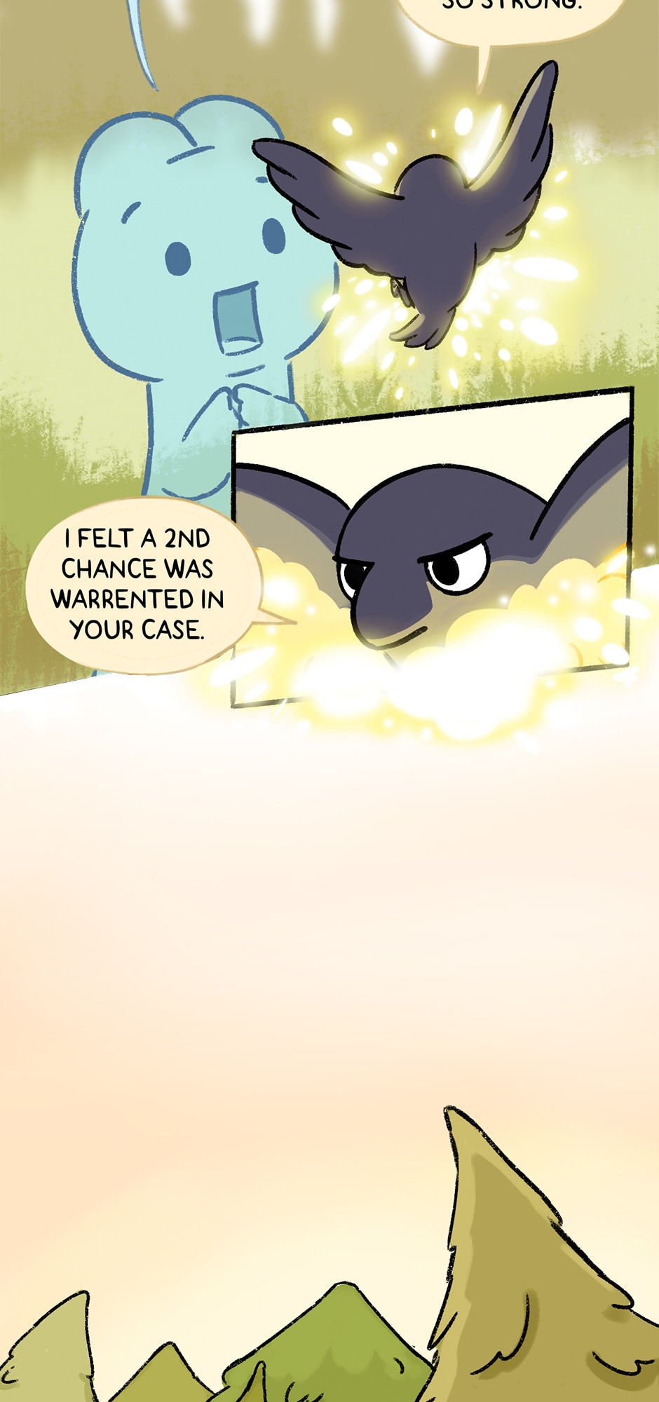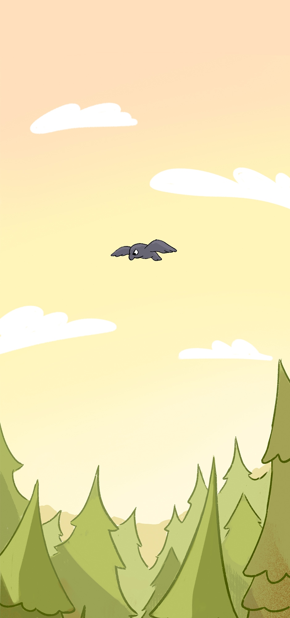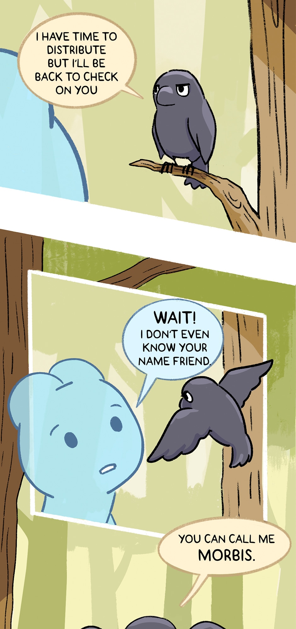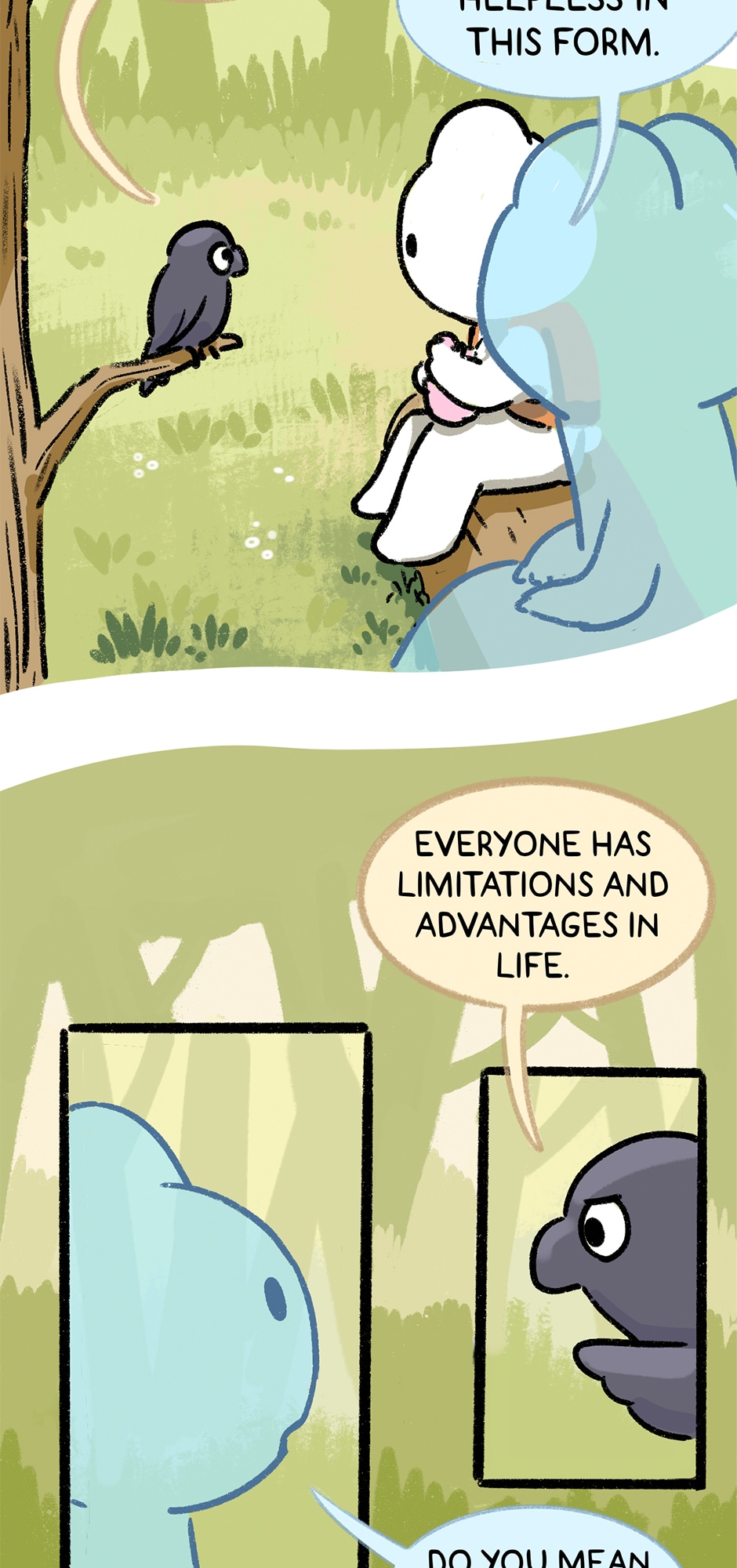 I like that picture of them crossing the wooden bridge. I like the trees and the water, and the little frog fishing. I agree with the crow. Frogs are cute. 🐸