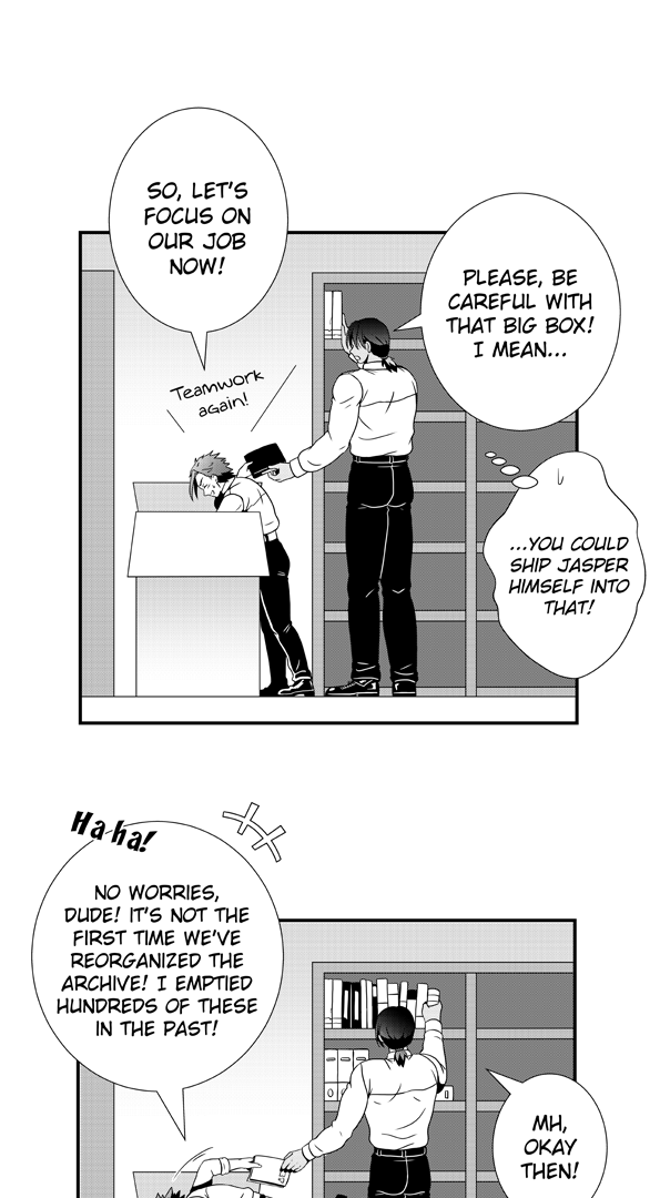 Jasper (1.58 m / 5.18 ft), an energetic and charismatic 34-year-old, is joined in his work as an archivist by the newcomer Liam (2.14 m / 7.02 ft), a meek and taciturn 26-year-old. An understanding will soon arise between the two that goes far beyond a simple working relationship.
