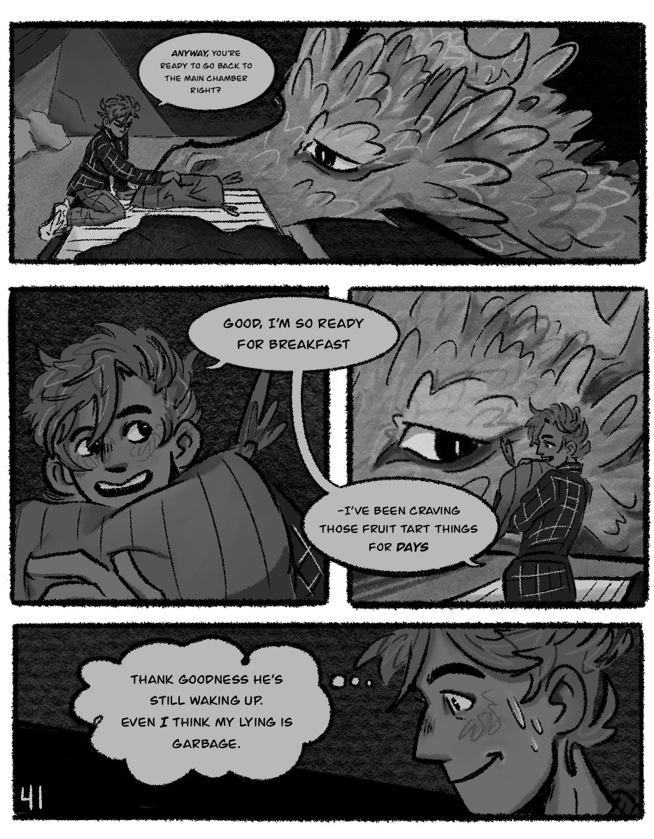 A black-and-grey comic about Em! They live with their Dad who happens to be a dragon, and spend their days collecting and sorting items for their hoard. Together they find a lot of really cool stuff, but find it easy to compare their self-worth with the numerous valuable artifacts in the family vaults. After all, how can one run-of-the-mill human child compare to the weapons of mass destruction, piles upon piles of gold, and stacks of ancient knowledge that sit in their own pantry?