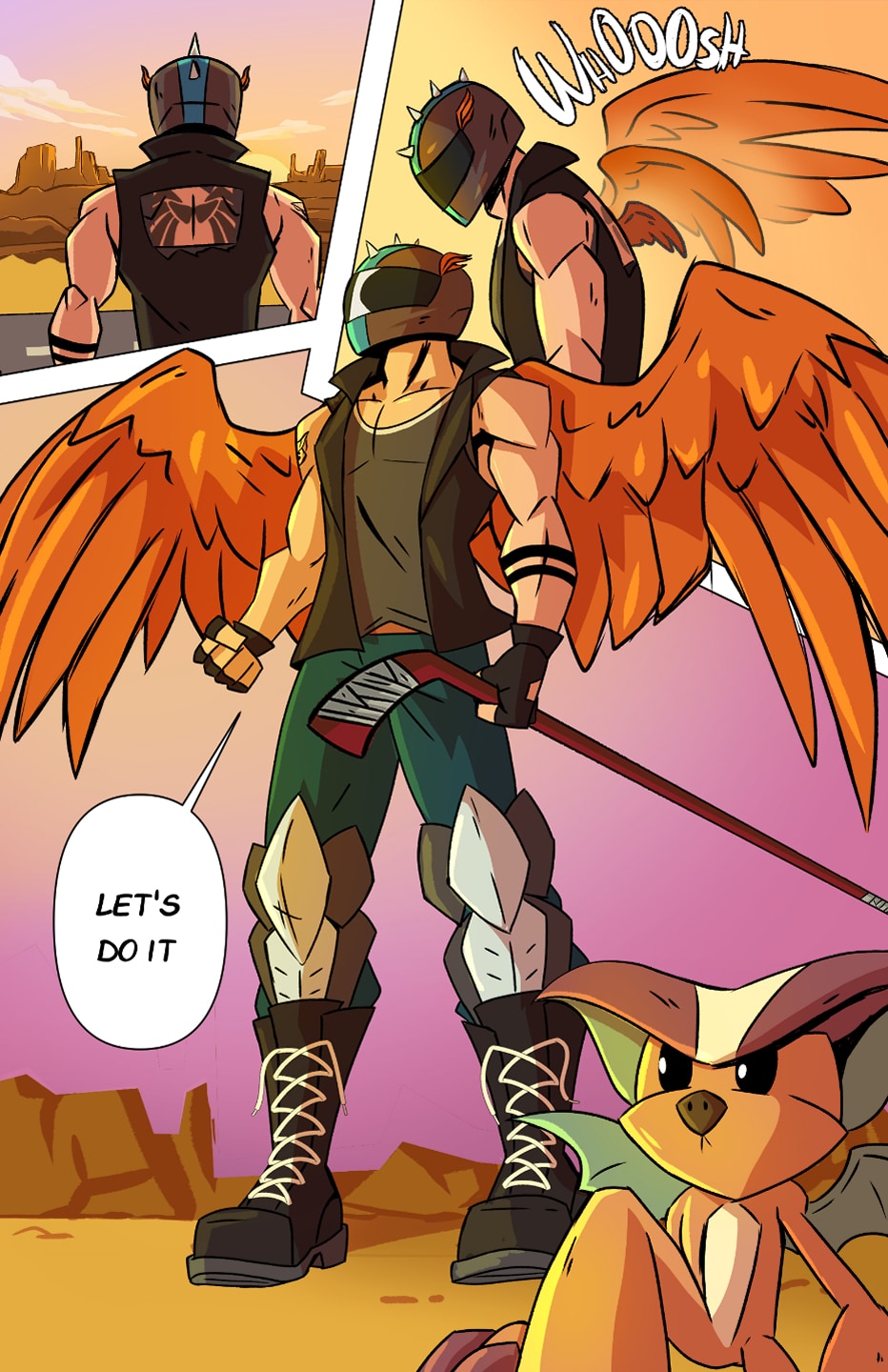 Oh, neat, he thought to cut that hole in the back of the shirt! Answers how he manages to wear one at all with his wings. Very good!