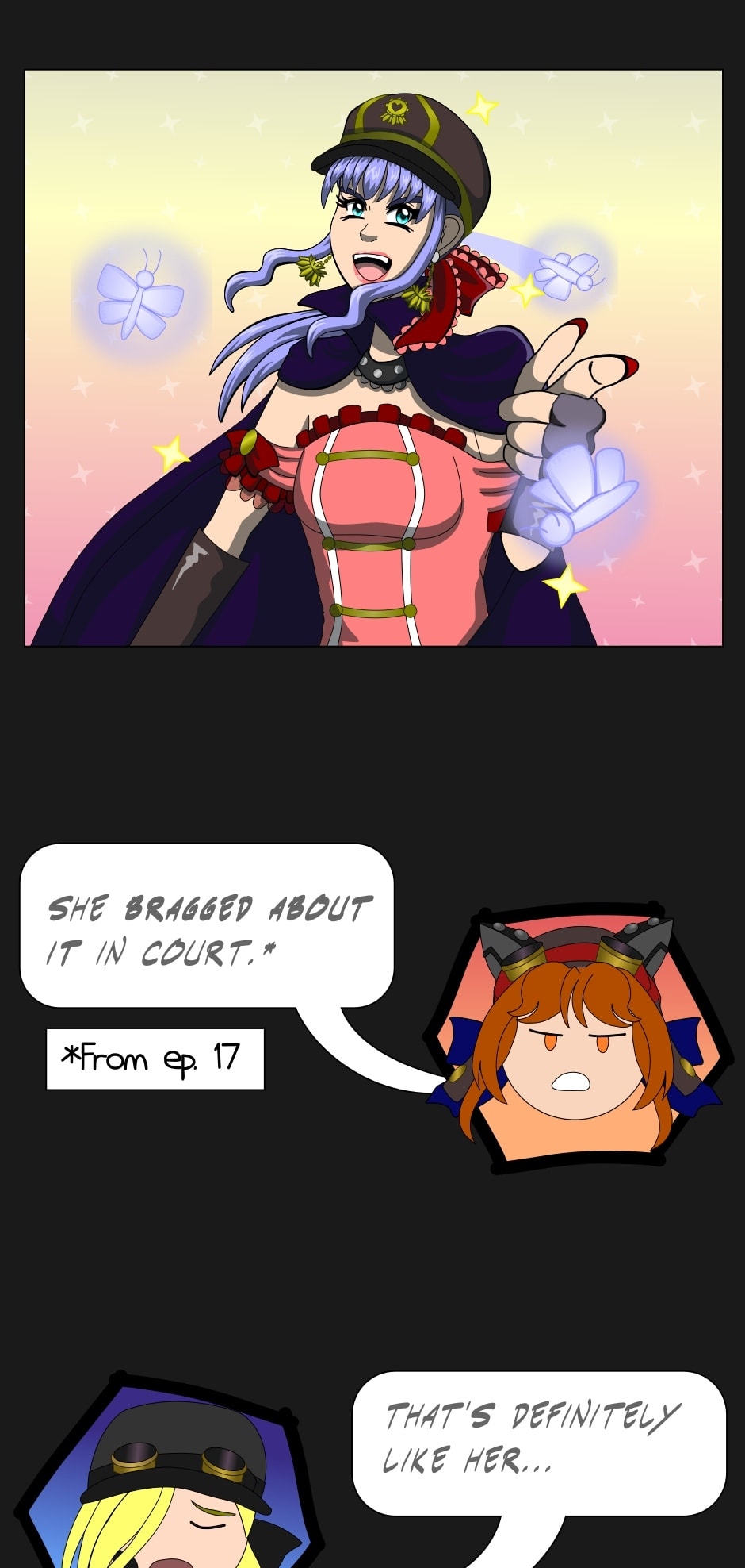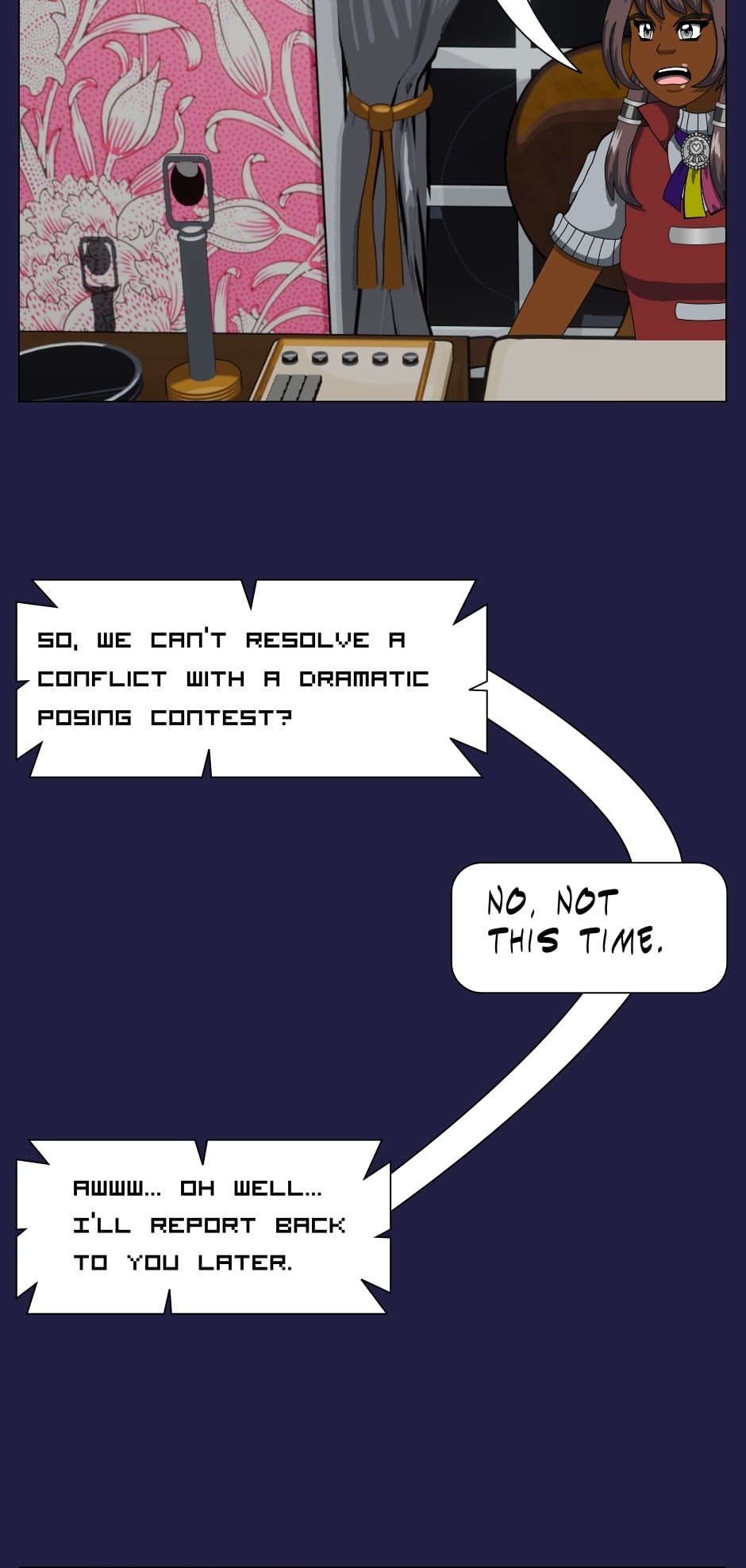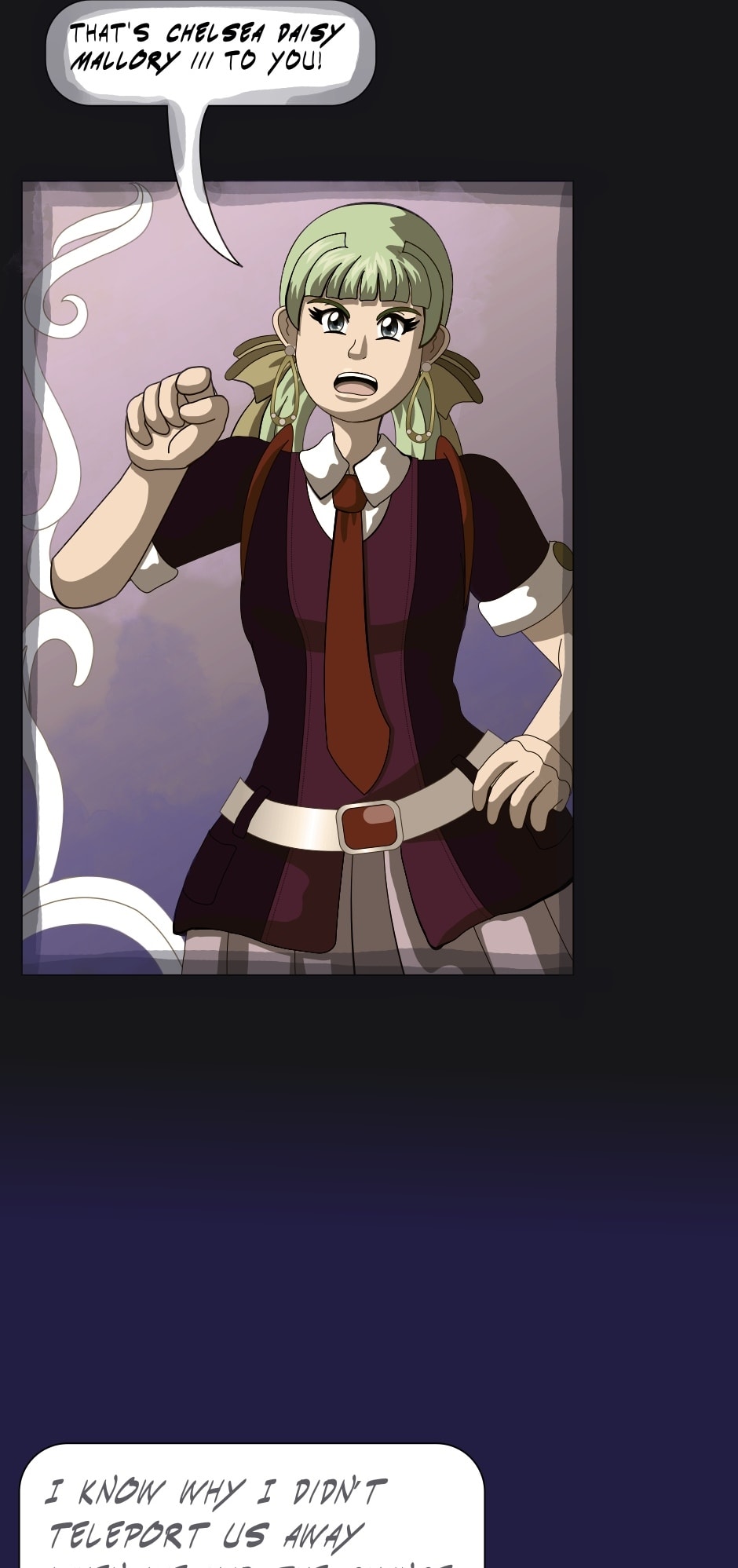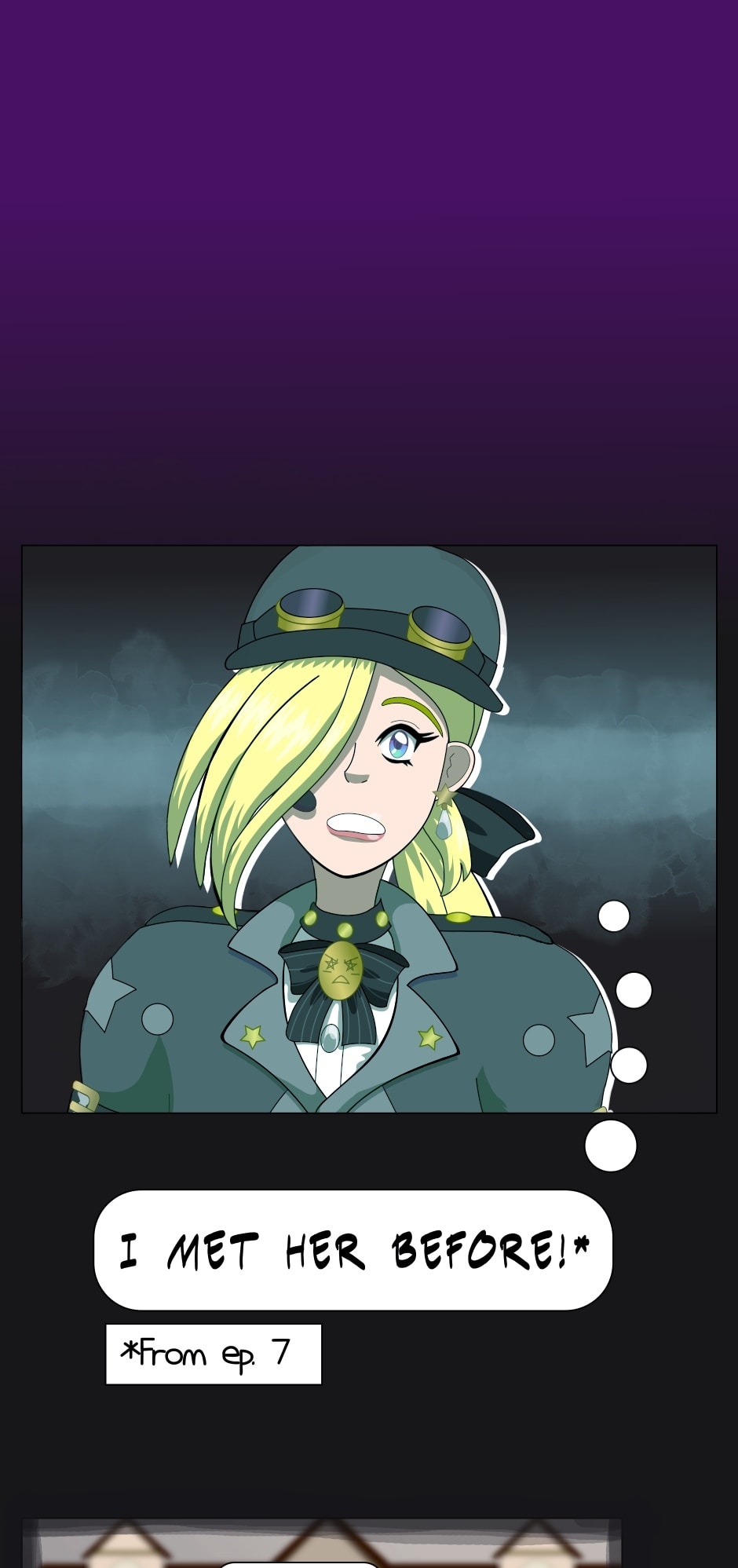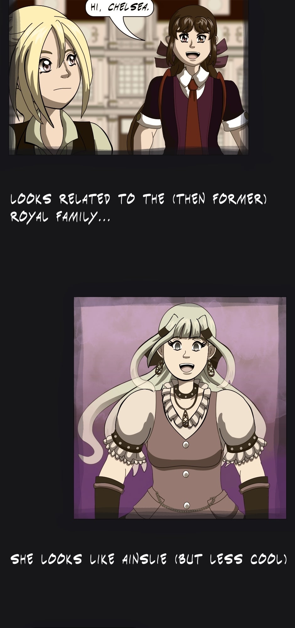 This episode started with a pop quiz but you won’t be graded on it 😅 Lucy is a fourth wall-breaking joke character and one of the characters to appear in this episode who hasn’t in a long time; she last appeared in episode 28. Monica and Ainslie also re-appear, though the panel of Ainslie is just a filtered version of her appearance from episode 25. Still it’s been more than a year real time 😭