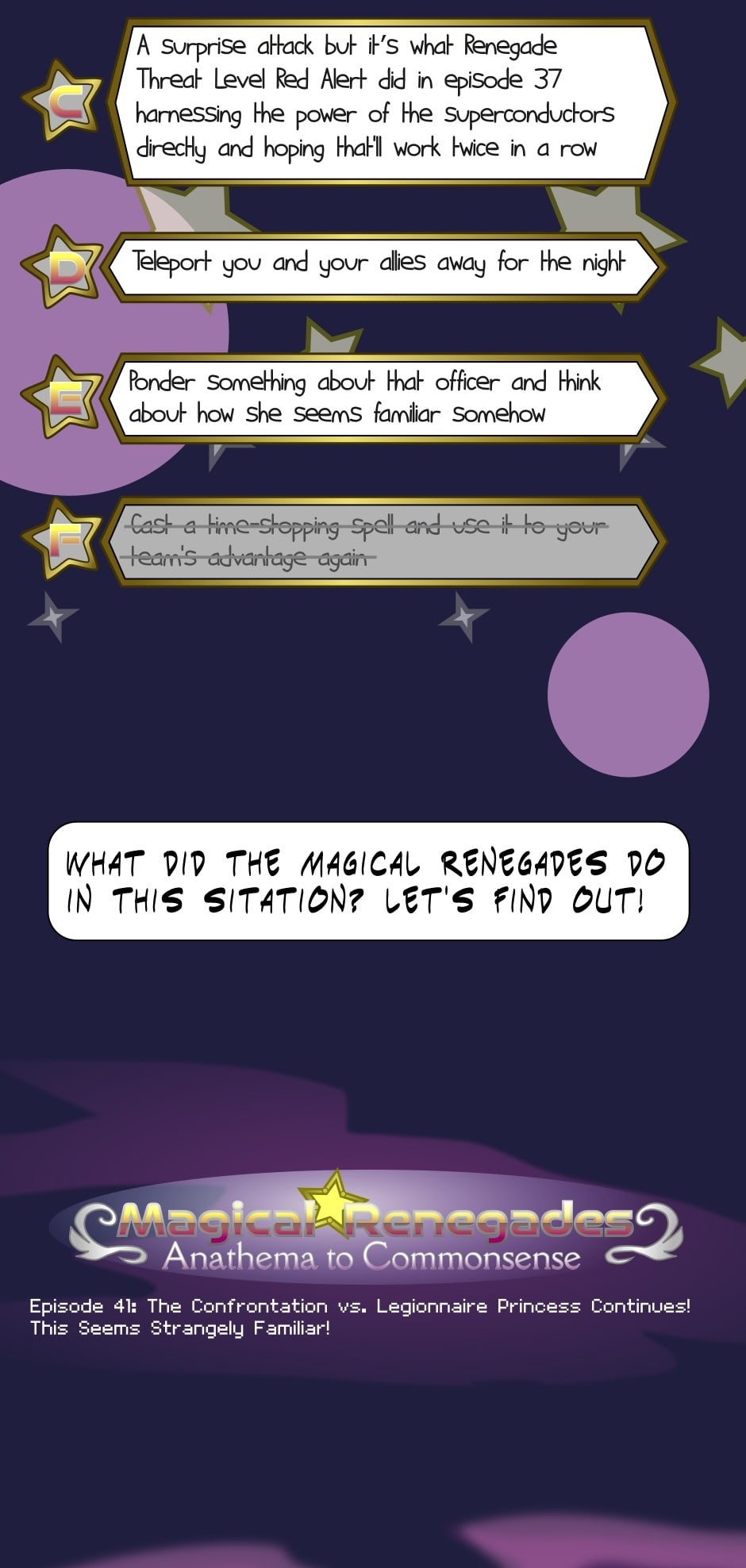 Follow the tale of the Magical Renegades as they seek more recruits, and try to work together! However, raw power isn't everything. Sometimes, they must think outside of the box even if it means going against commonsense!