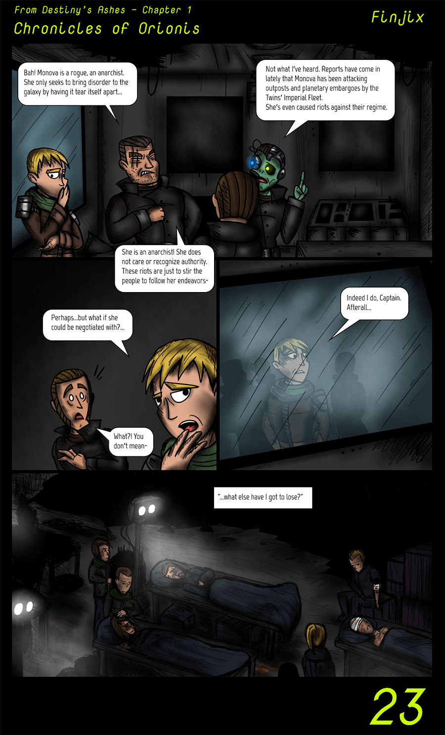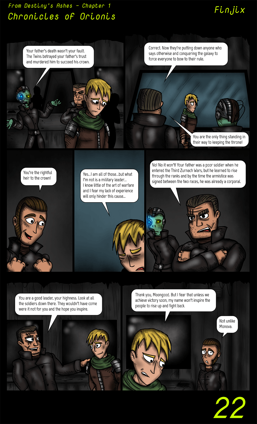 This is a sci-fi story about the former queen of machines, Monova, and her quest to not only put an end to the nefarious Twin Emperors' twisted rule on the galaxy Orionis, but also somehow stop the dark lord Aklanarok - Judge of the damned - who seeks to unleash his darkness on the entire universe.