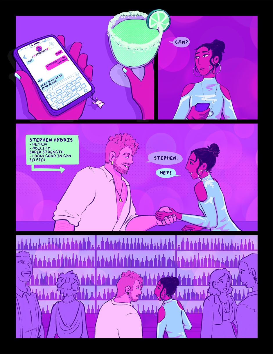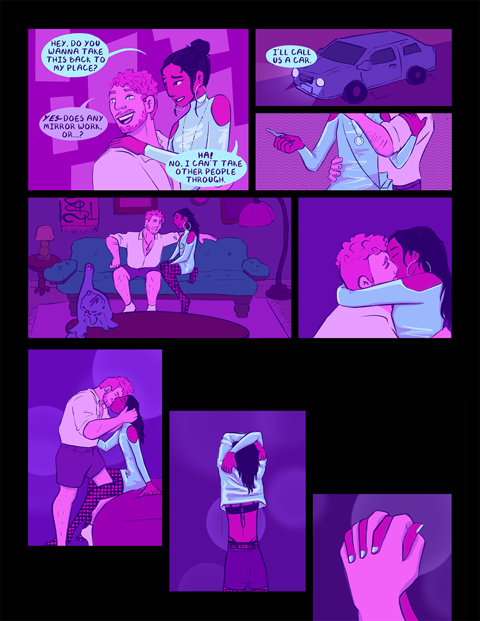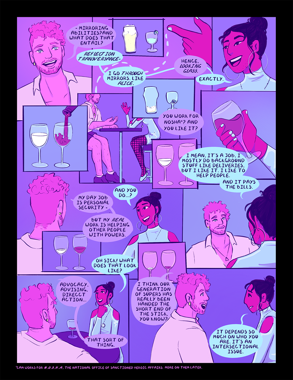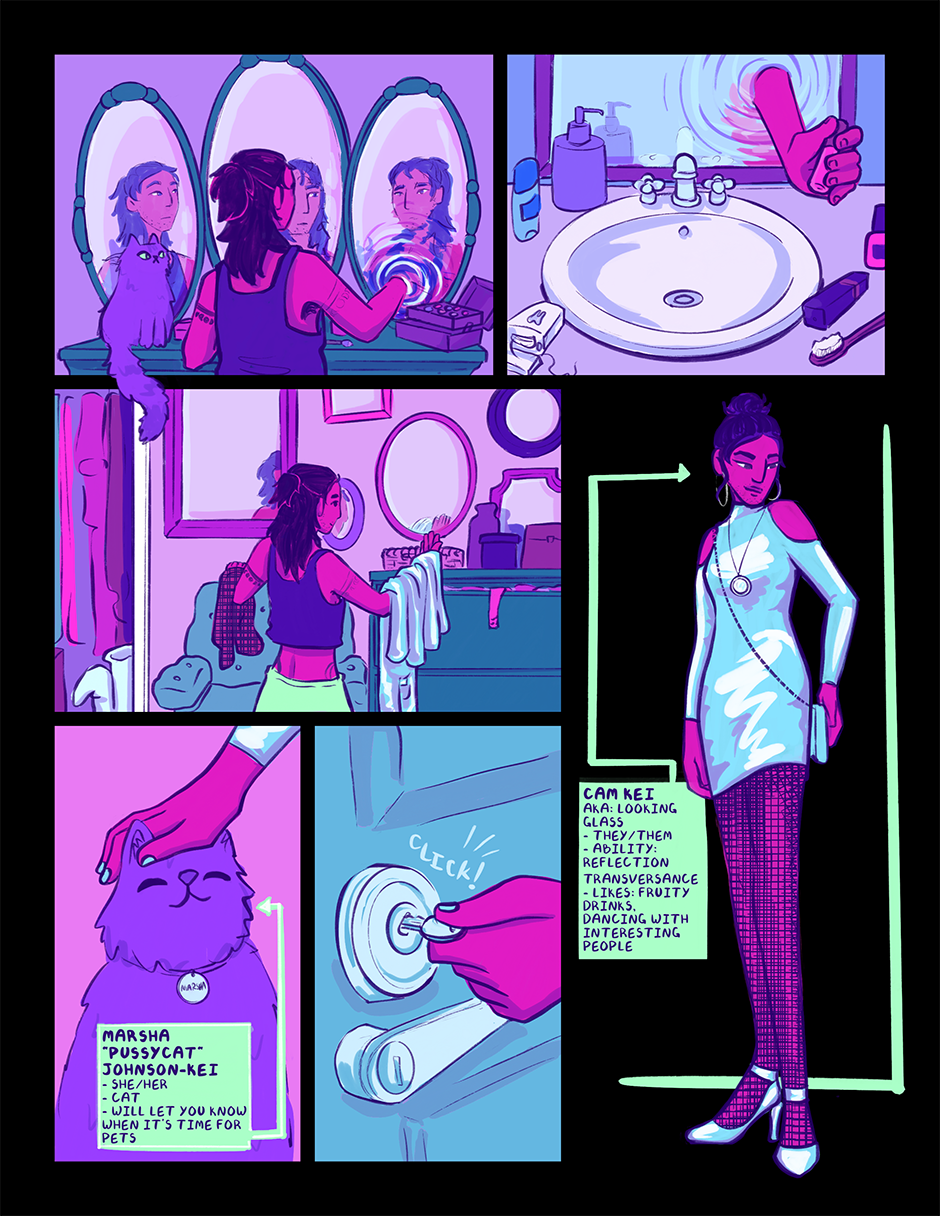 Cam Kei is a twenty-something year old with the ability to travel through mirrors. Despite having superpowers, Cam tries their best to live a normal life. They clock out of their superheroic day job to go dancing, hang out with their friends, and go on dates. That is, until they meet the alluring Stephen Hybris, and a mission well above Cam’s pay grade ends up in a world-shattering conflict that they never signed up for.
