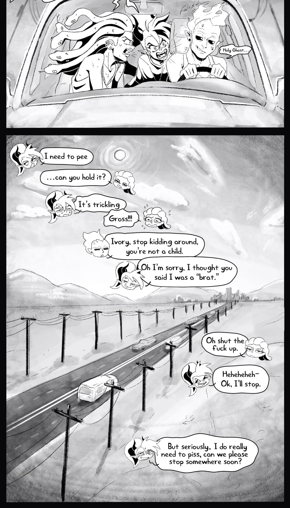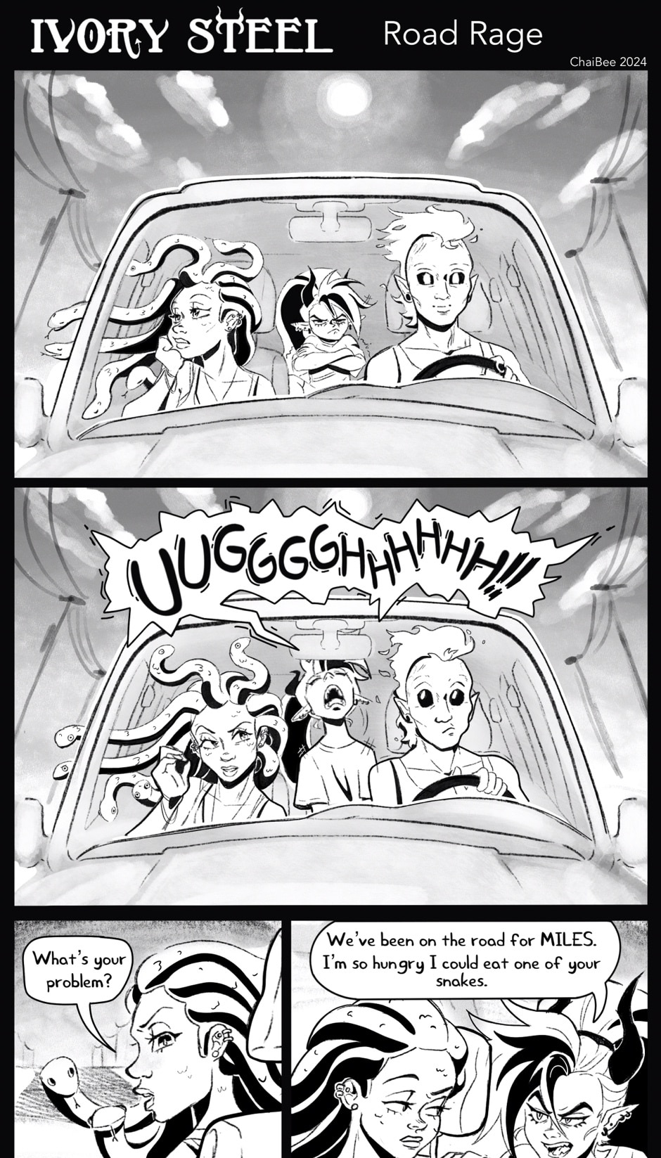 Ivory's not alone- along the way she meets two cool cryptids that formulate her band, IRON OXIDE. Featuring: The bassist, Dahlia, a gorgon college student trying to get by. The drummer, Specter, a ghoul with freaky flame hair and a chill vibe.