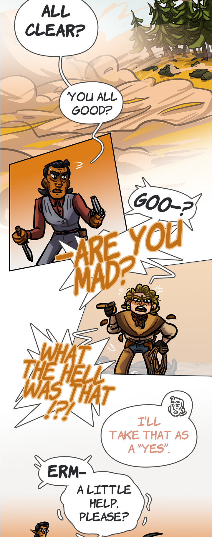 In a land far far away, magic is fading and the world is evolving fast. In this dusty west, a strange party is on a ride to find a dangerous wanted man. But they will stumble on a lot, and this quest might be of some greater kind than what they expected. WFW is a queer story set in a western / wild west fantasy world.