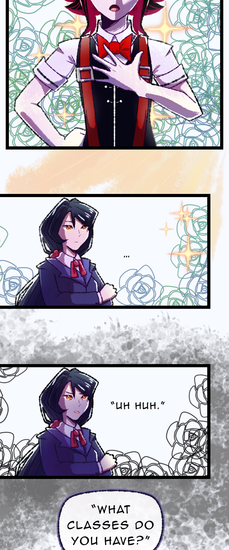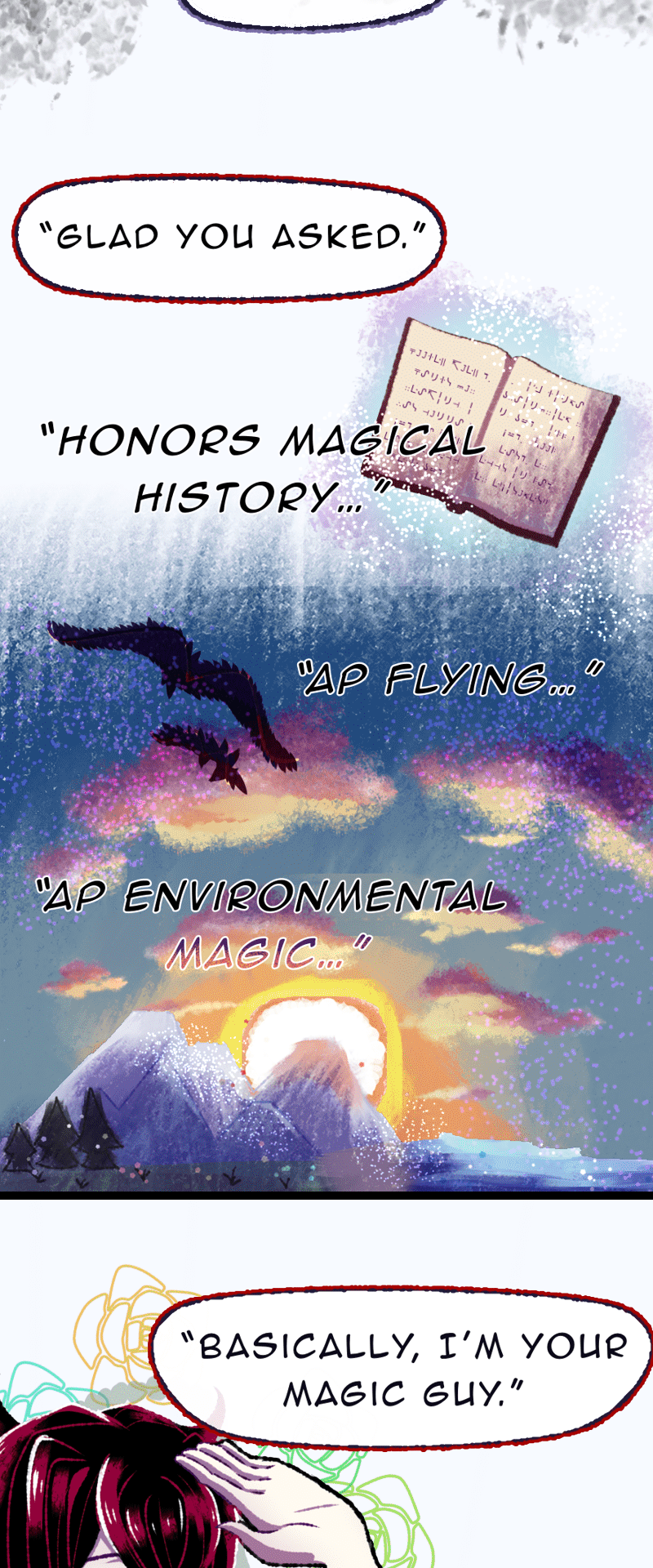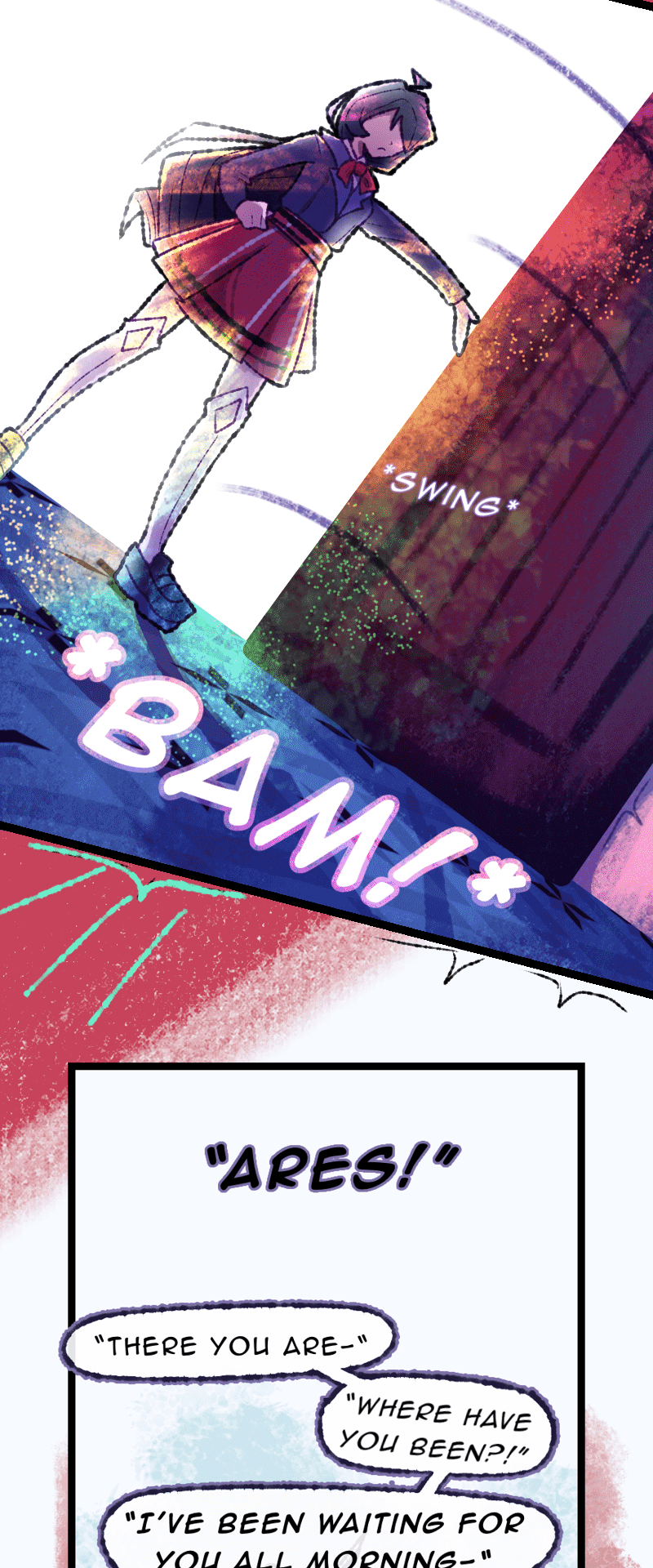 UPDATES EVERY FRIDAY [] Welcome to Divinia High, a school full of magic! Our protagonist, Chizuru, is completely incapable of magic and must navigate a world hostile to her existence. Join Chizuru (Act First, Think NEVER!), Ares (Short “King” w/ Theater Kid vibes), Leila (Geek-a-Tron 5000), Rosaria (The Best person you’ll ever meet), and… Elio (The WORST) on their misadventures through Divinia High and discover the mysteries of the Six Sovereigns…