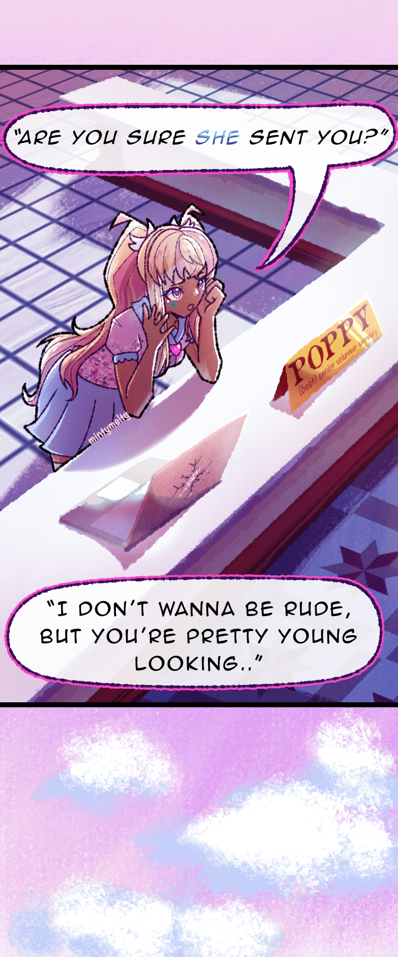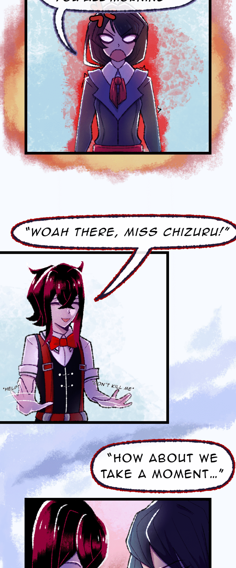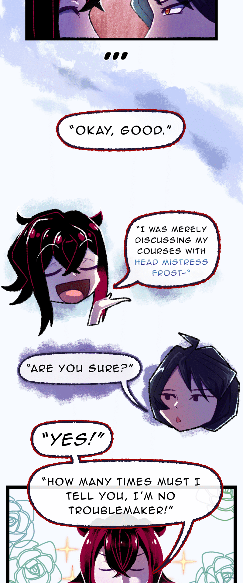 UPDATES EVERY FRIDAY [] Welcome to Divinia High, a school full of magic! Our protagonist, Chizuru, is completely incapable of magic and must navigate a world hostile to her existence. Join Chizuru (Act First, Think NEVER!), Ares (Short “King” w/ Theater Kid vibes), Leila (Geek-a-Tron 5000), Rosaria (The Best person you’ll ever meet), and… Elio (The WORST) on their misadventures through Divinia High and discover the mysteries of the Six Sovereigns…