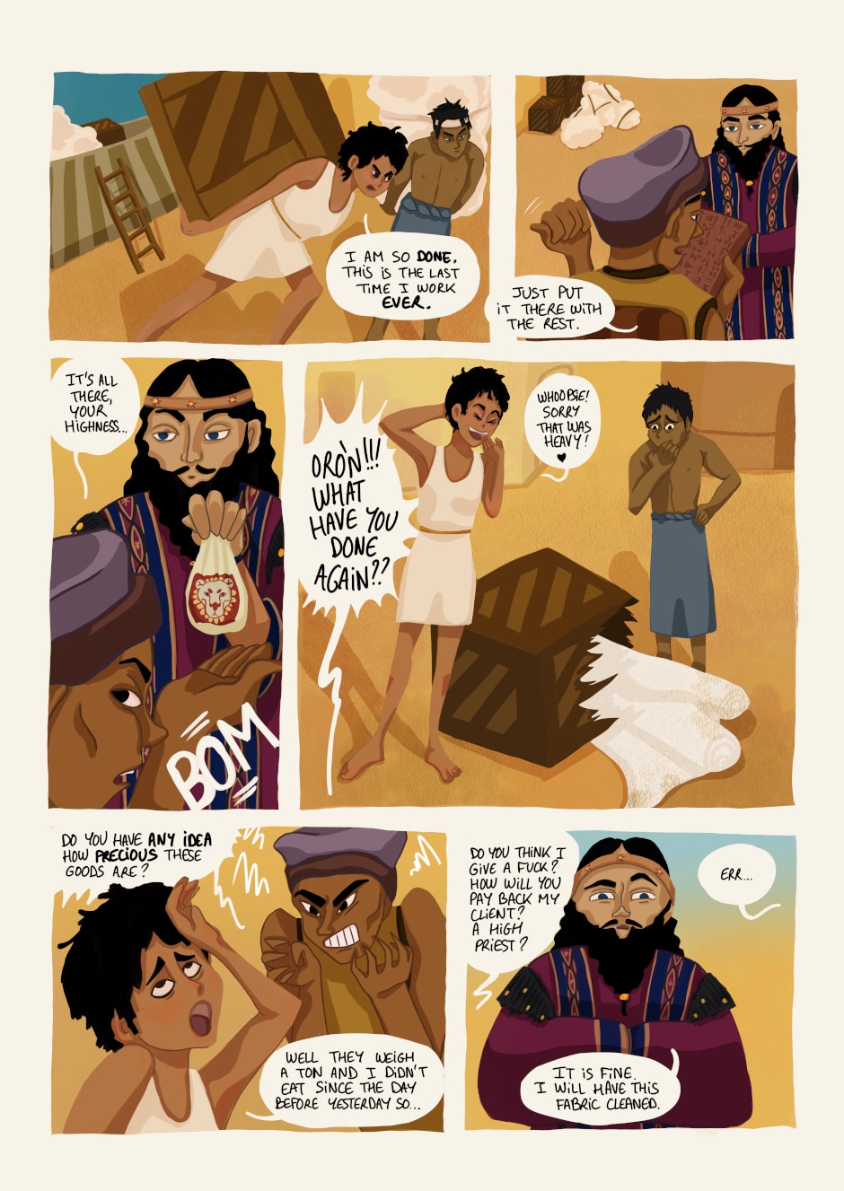 Orón is a young inhabitant of Ninive, Mesopotamia. She loves nothing as much as sneaking into forbidden places, but when she annoys the city guards once too often, she is forced to follow meditation classes at the School of Gods. Not only is it boring to death, but her fellow students are dumb privileged kids. Gods are nice, in general, especially Adad who blows cool tornados, but why are there more and more of them? And why is the goddess Ishtar furious against everyone?