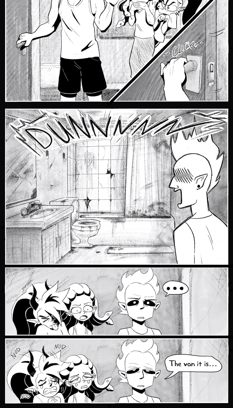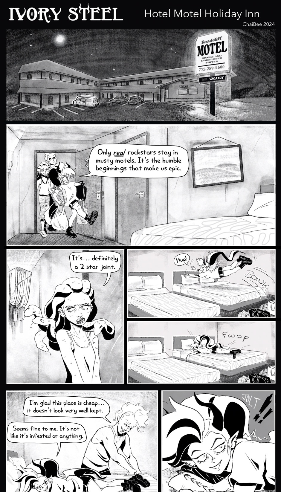 Ivory's not alone- along the way she meets two cool cryptids that formulate her band, IRON OXIDE. Featuring: The bassist, Dahlia, a gorgon college student trying to get by. The drummer, Specter, a ghoul with freaky flame hair and a chill vibe.