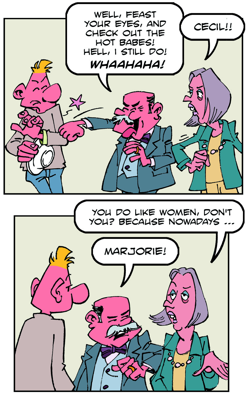 On the weekend, he goes to the pub to meet his friends, Fred and Stan.