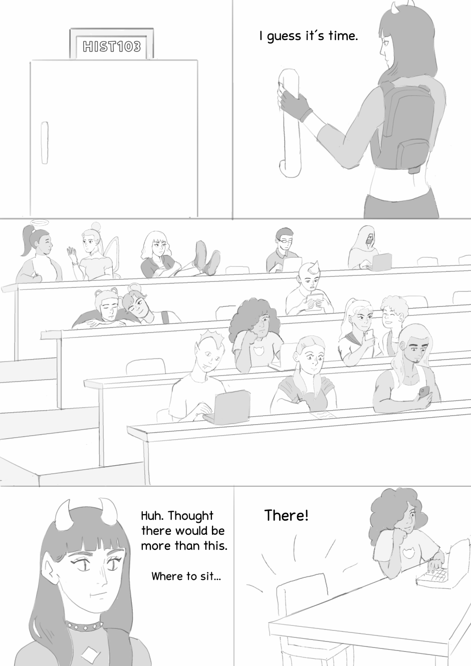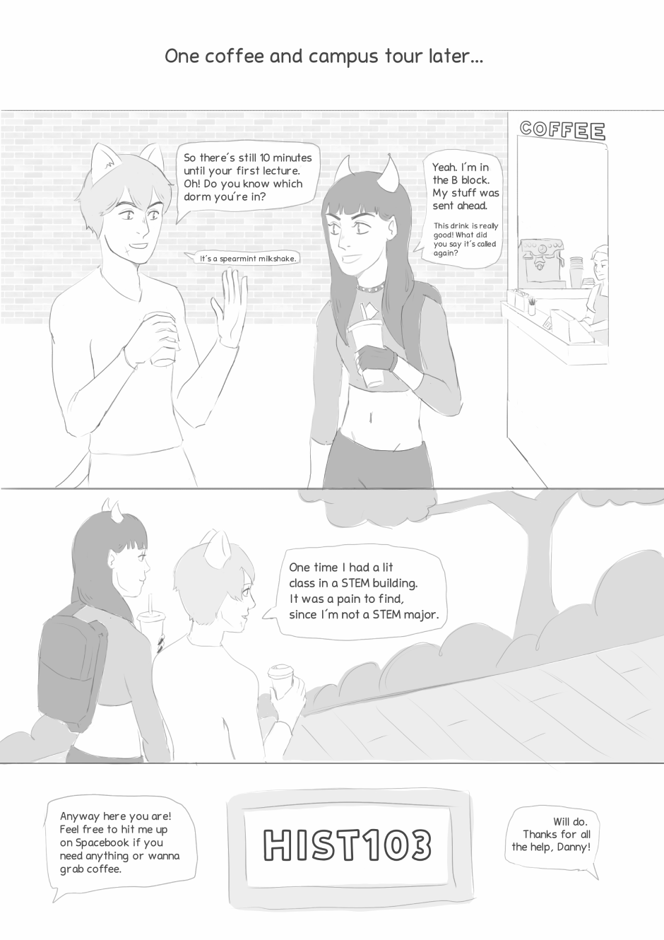 ehehehehe i rly love the world build you're doing here. it def feels like a college campus + extra supernatural vibes. you get so much expression through the characters' body language too.