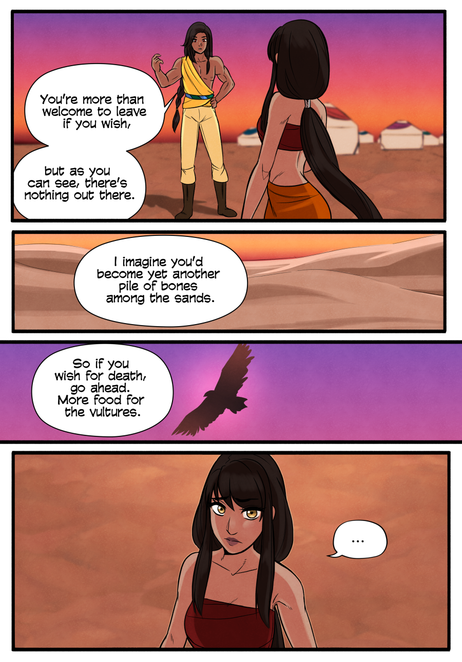 After her home is destroyed, Jhuna is taken to live with a tribe of desert nomads. She must adapt to her new life whether she wants to or not, and learn to survive in such harsh conditions among people she shares neither a language or culture with. Some parts of her new life might not be so bad, though…