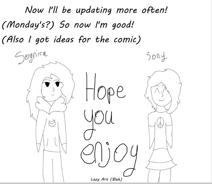 Hello! This is my first comic (Not kidding) but I have great ideas! Anyway sides is the two parts of who I act like Sony and Sognira (So-near-uh). They are both my name and nick name but they have bits of my personality and how I act. Sony is energetic and always happy and cheerful willing to talk to anyone while Sognira is the opposite. Sognira's the embodiment of all the negativity that Sony doesn't have though Sognira isn't all that bad she has very profound things to say at times. Sognira and Sony do share traits too they have the same sense of humor, taste in music, and what they find attractive! Of course they are me so there's going to be memories of different things and how they reacted and even just things in general! WELP! I hope you like this comic! Also updates whenever I can (or I feel like it)