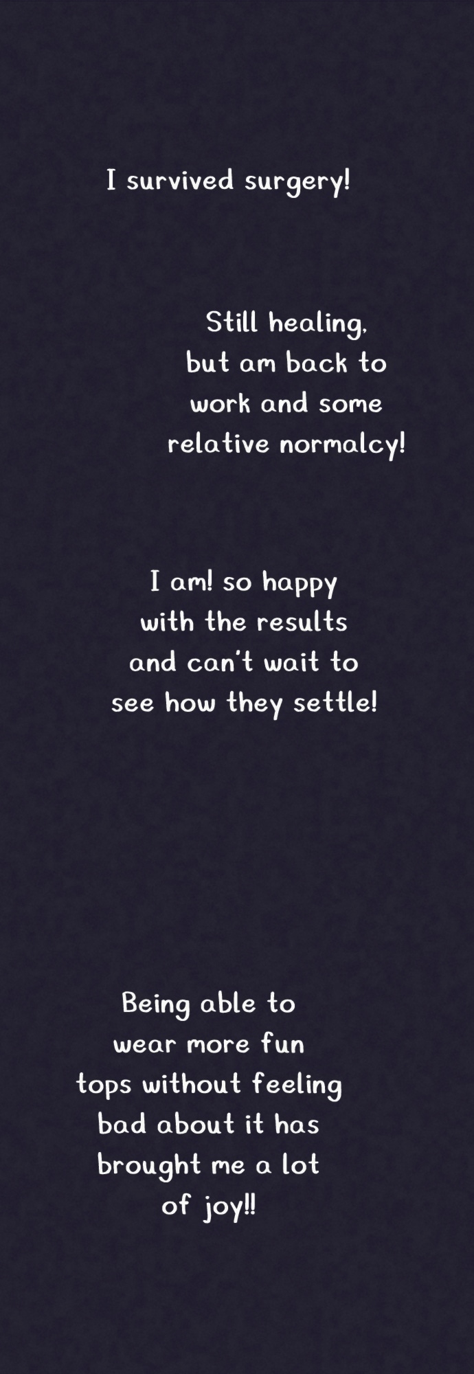 Hello!! Didn't have any complications! I'm 6 weeks out today, and all is well (except the dissolving staples, but those are mostly just annoying). Anyways! Hope you enjoyed these weird little nonbinary guys!