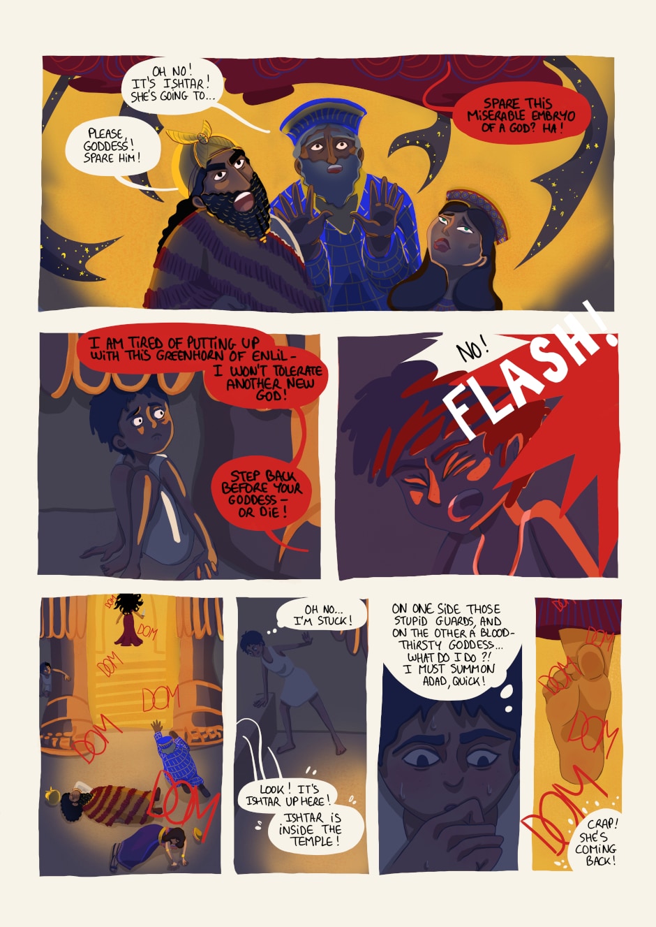 Orón is a young inhabitant of Ninive, Mesopotamia. She loves nothing as much as sneaking into forbidden places, but when she annoys the city guards once too often, she is forced to follow meditation classes at the School of Gods. Not only is it boring to death, but her fellow students are dumb privileged kids. Gods are nice, in general, especially Adad who blows cool tornados, but why are there more and more of them? And why is the goddess Ishtar furious against everyone?
