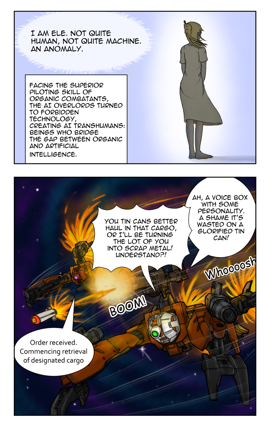 In a distant galaxy ruled by AIs, space couriers Ele and her team are entrusted with a mysterious cargo: an empty AI Transhuman body. Pursued by AI agents, Ele must fight back using her Exomec, a customizable mech for space travel. As the chase unfolds, Ele, an AI existing within an artificial body, embarks on a journey to learn humanity and fight for her newfound freedom.