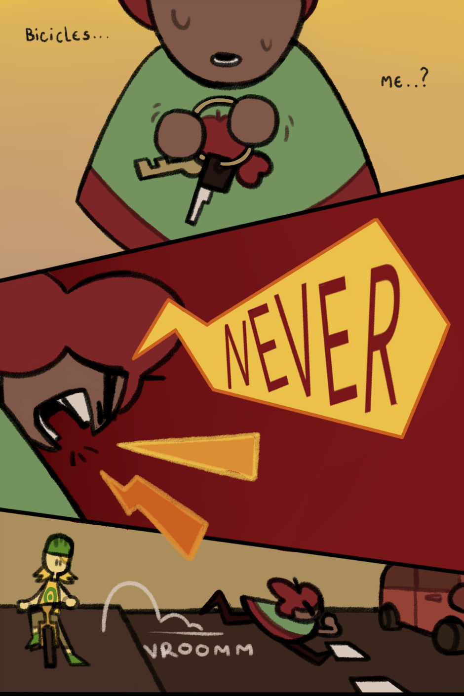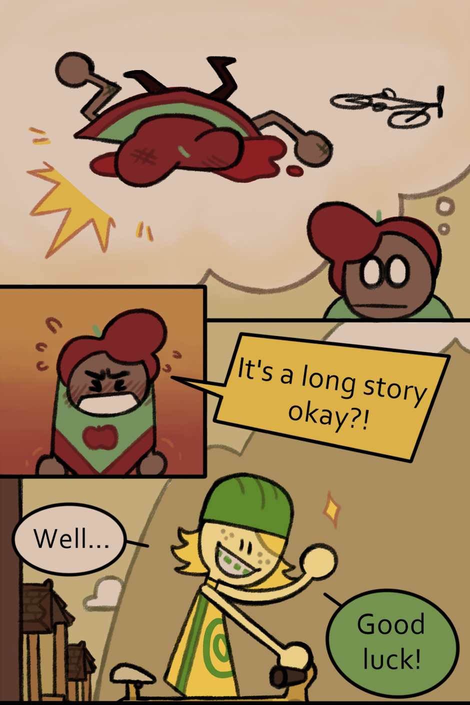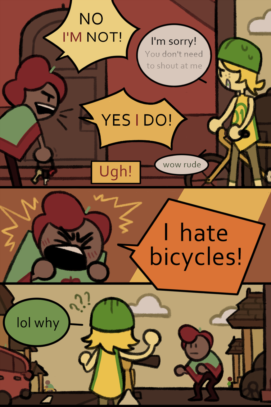 'Why do you hate bicycles?' 'Because bicycles killed my grandma, ok?'
