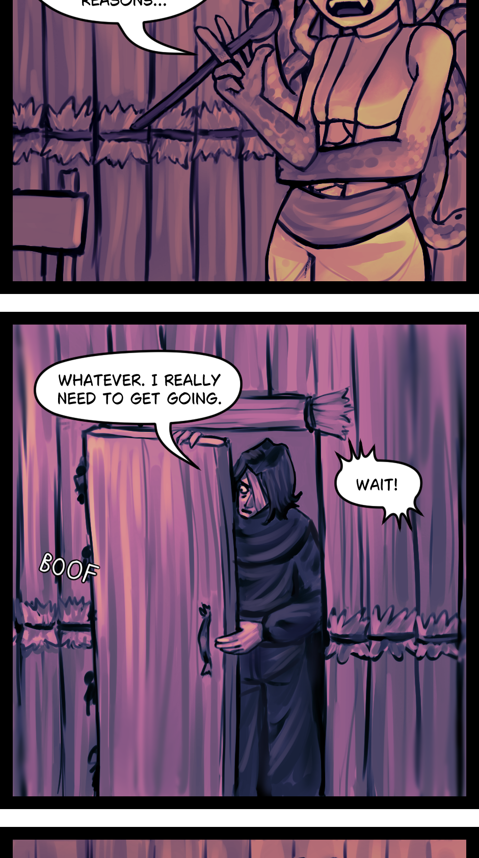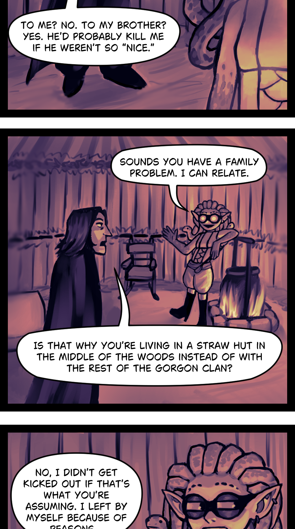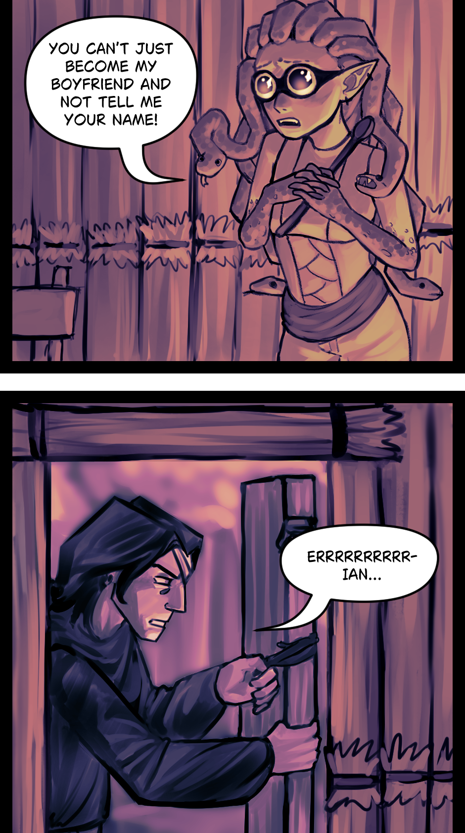 Some people use older English when their comic is supposed to be set a long time ago. In the comic the characters technically speaking some nonexistent language, but I translated it into modern English. I felt like using words like “boyfriend” and modern grammar would be easier for me, and just fit the vibe better.