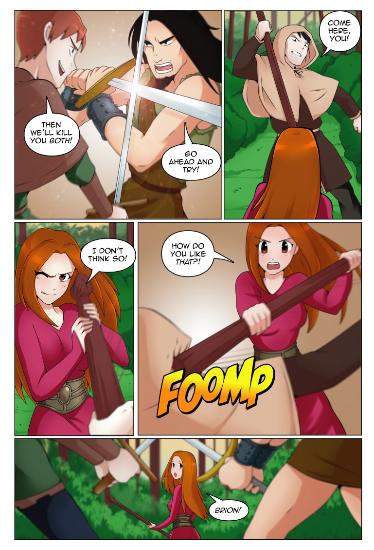 Queen Riona surprises the bandits with her fighting skills.