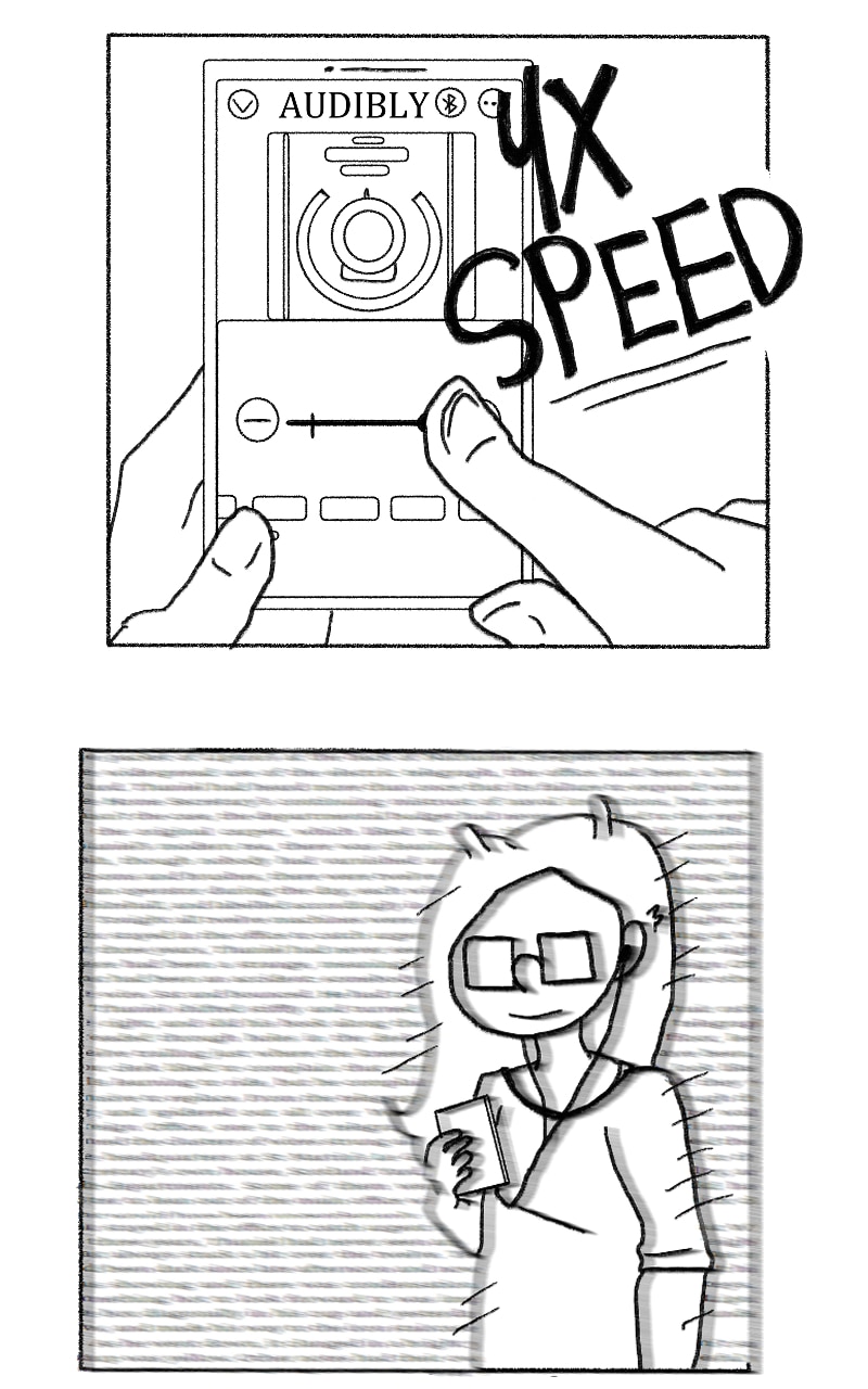 No hate to audio books, that's how I read most of my books too. It' just, I can barely follow the story on 1.3, how people do it on 2X or even 3X speed is crazy to me! Also, you can't tell, but she's listening to one of my favorite books recently: The Watchmaker of Filigree Street!
