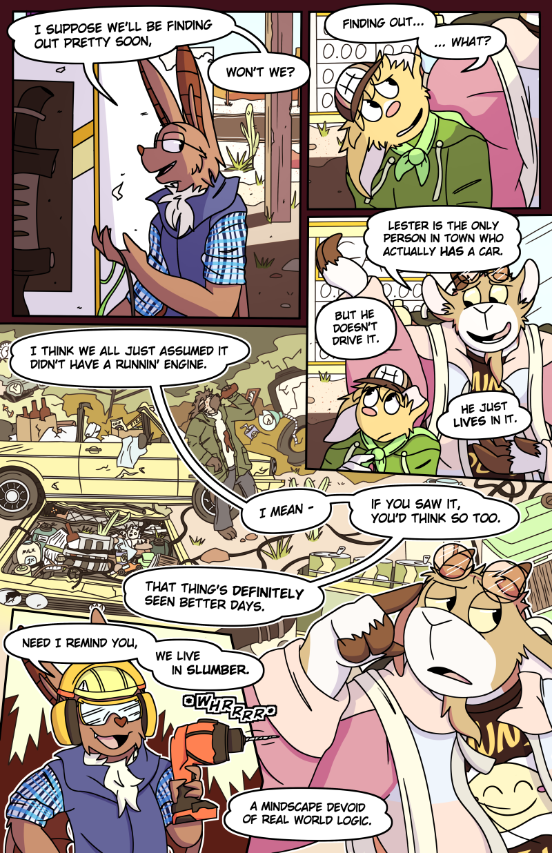 Most of the residents, including Romy, can't quite remember why they moved to Slumber... or how. Some memories get repressed, while others resurface. Life in Slumber isn't entirely normal - but then again, neither are its residents. As Romy, with their social anxiety, struggles to fit into this strange community... they are also faced with many mysteries and challenges. Waking nightmares, a telepathic cellphone, and an antagonistic psychologist, just to name a few. All the while, they set out to try to help the residents with their personal problems, hoping to make their lives in Slumber - and with each other - a little easier.