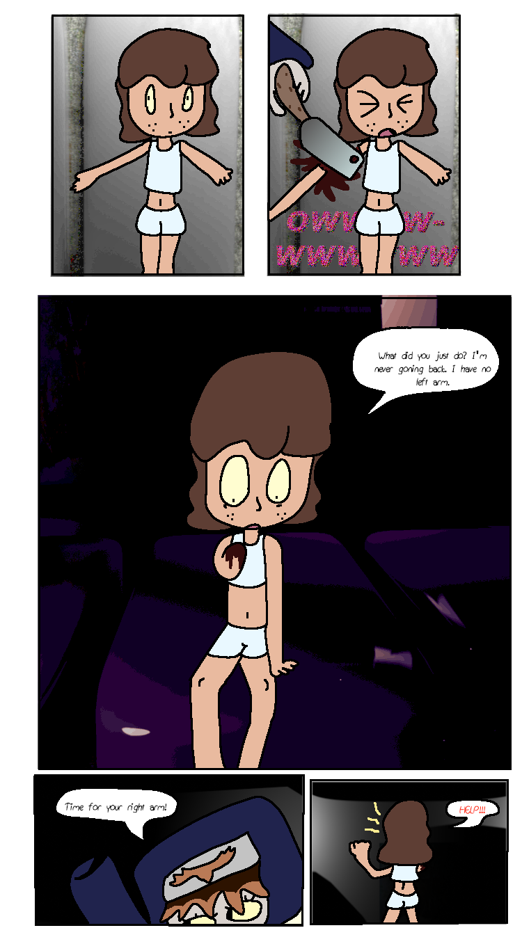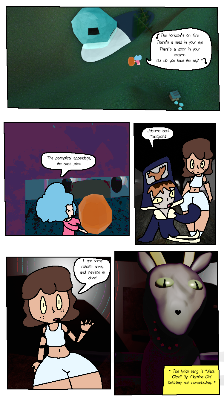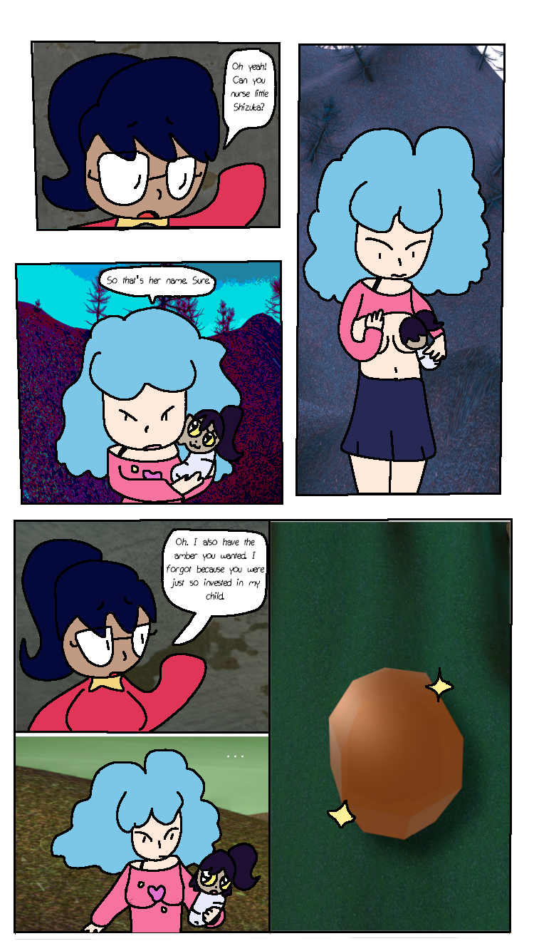 Victoria has her arms amputated and replaced with robotic arms. Meanwhile, Arora contemplates about "going into labor" (not like working in a low-rate Walmart, like popping out a little baby), "borrows" Ichika's baby (soon to be akuzihS) and finally gets amber to but Venison, the deer god, into. And finally some shading! Yippee!