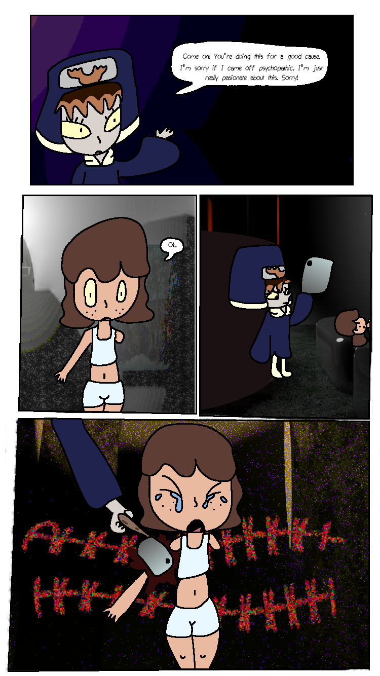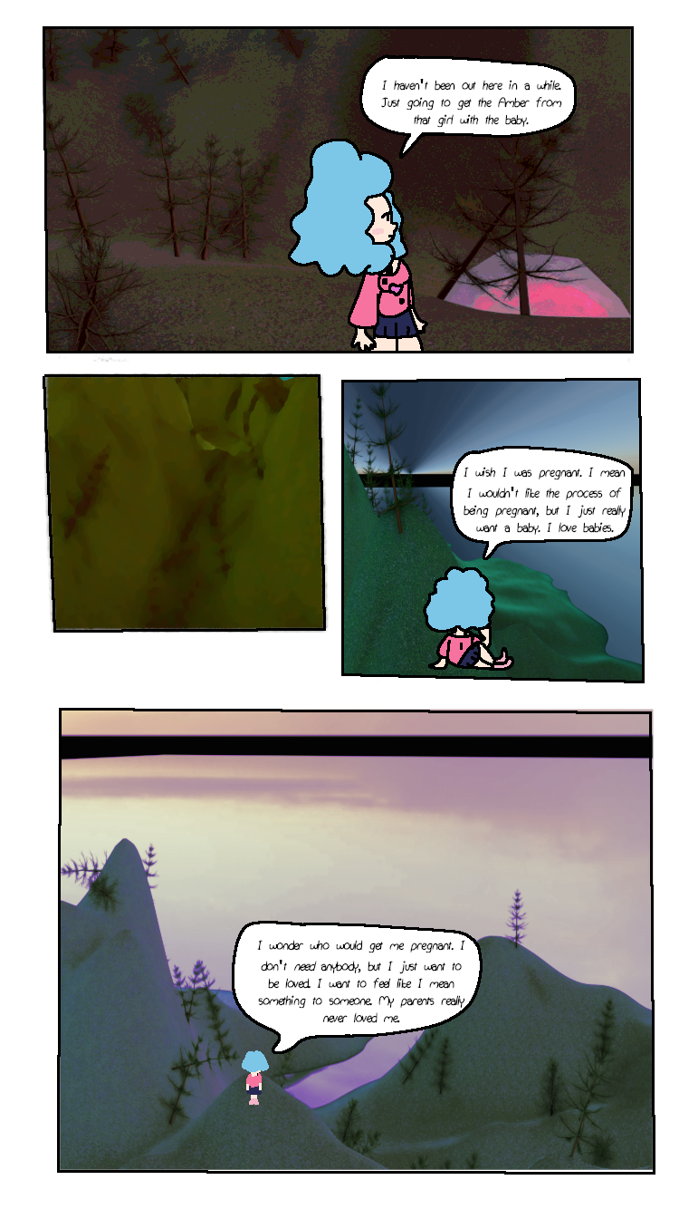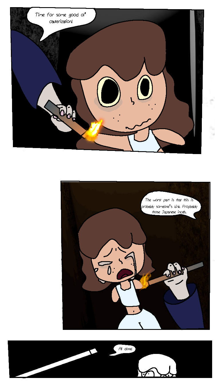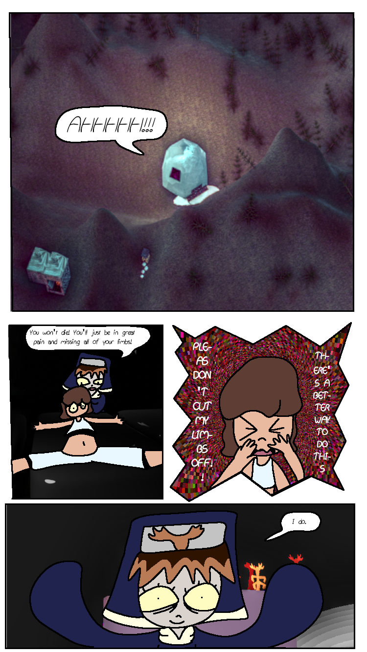 Victoria has her arms amputated and replaced with robotic arms. Meanwhile, Arora contemplates about "going into labor" (not like working in a low-rate Walmart, like popping out a little baby), "borrows" Ichika's baby (soon to be akuzihS) and finally gets amber to but Venison, the deer god, into. And finally some shading! Yippee!