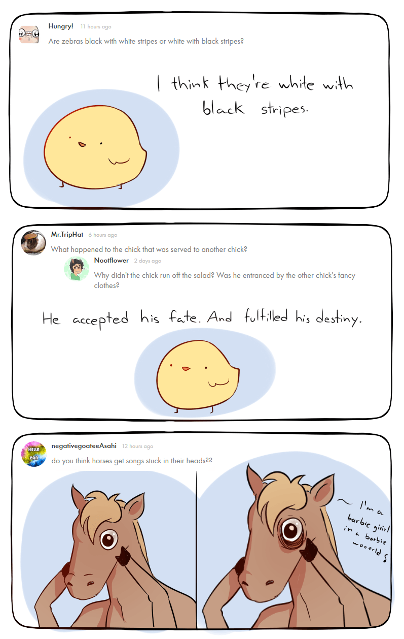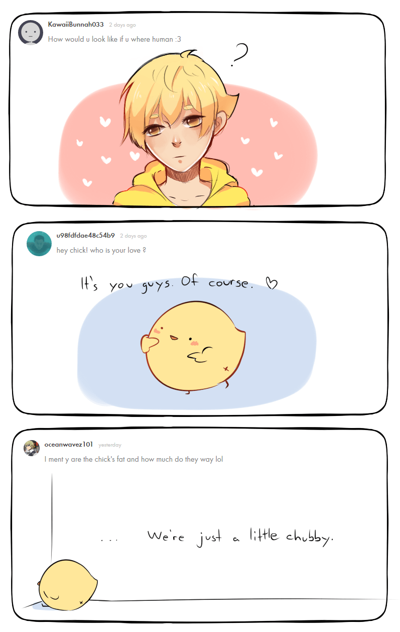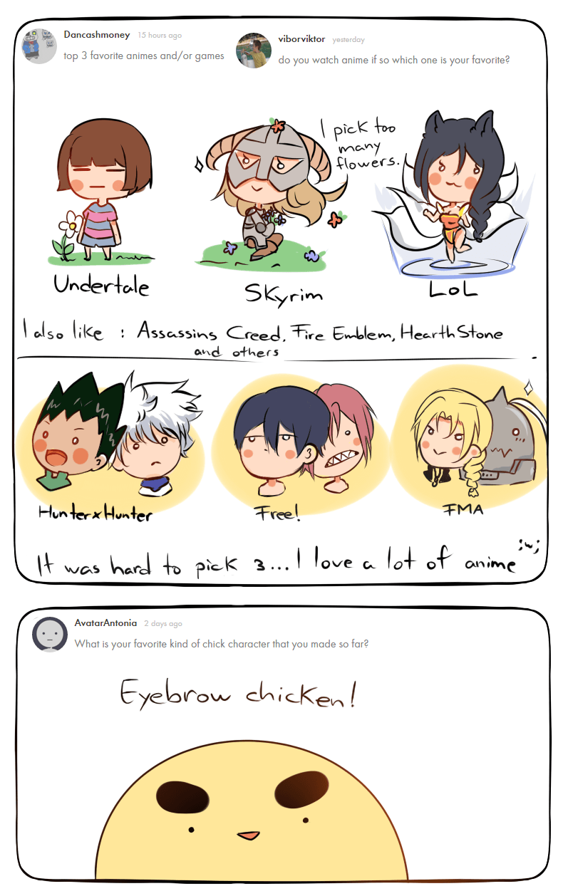 Thank you for all the questions !! You guys gave me a lot of work haha. I am going to answer more questions soon. Please have patience with me ;w;