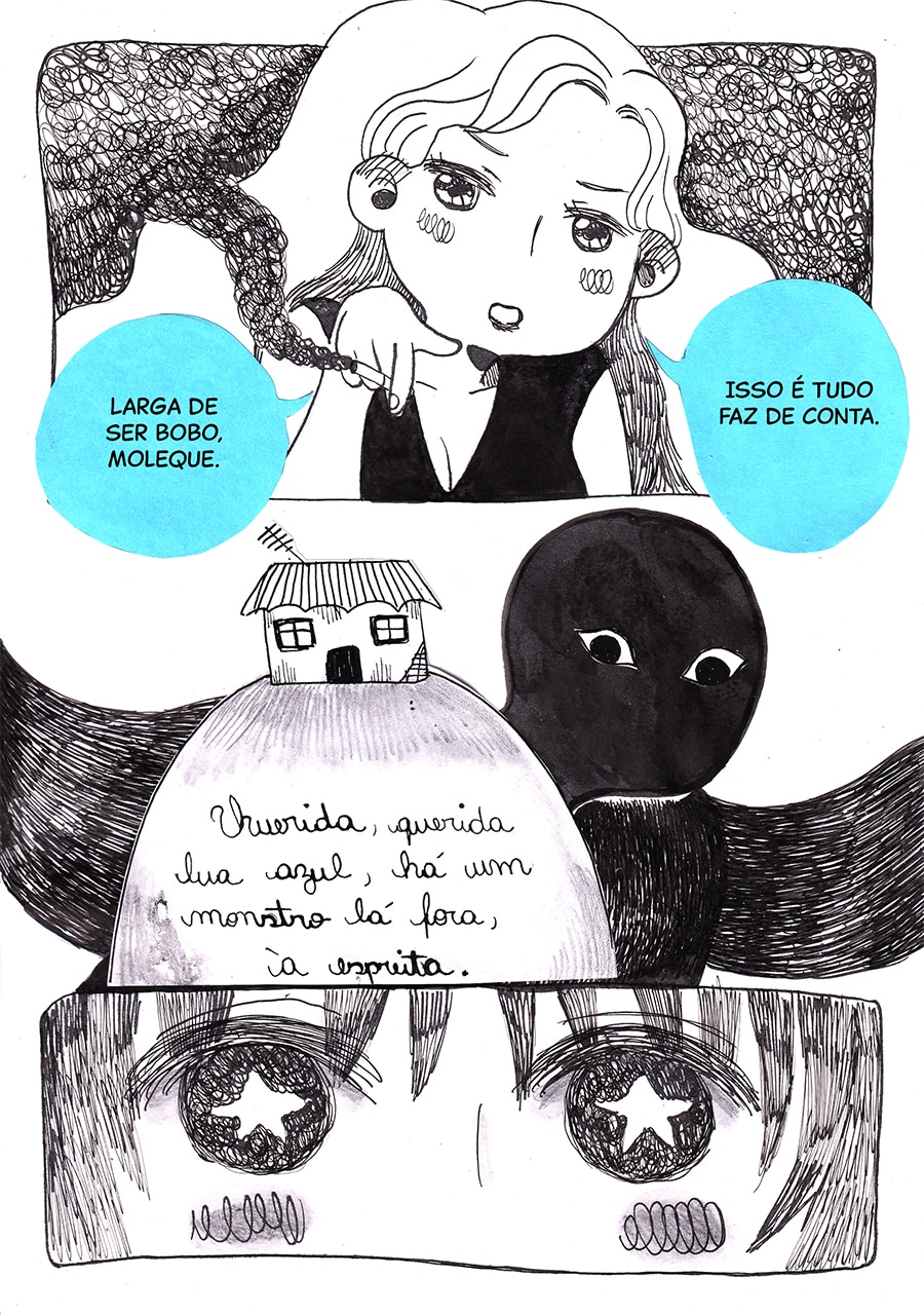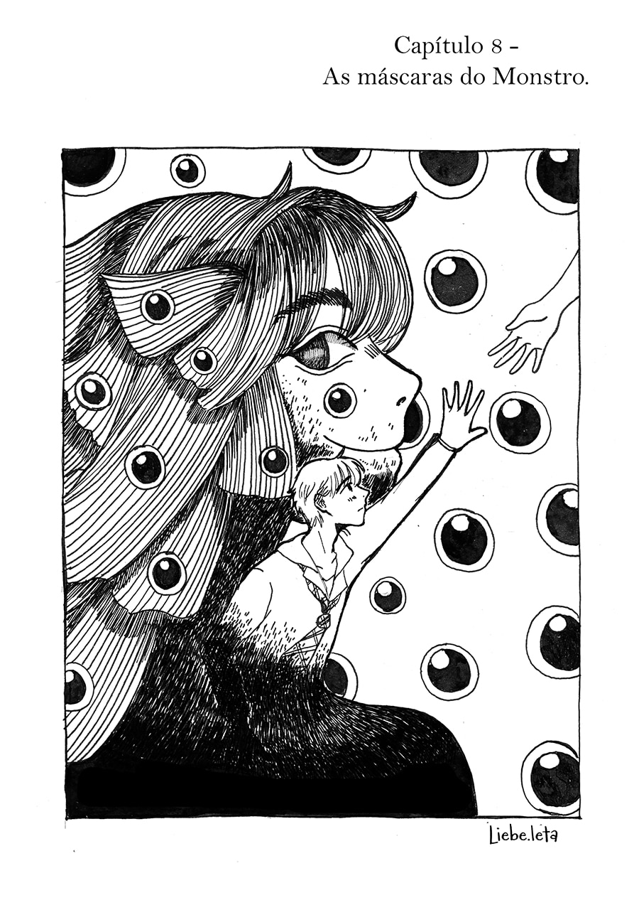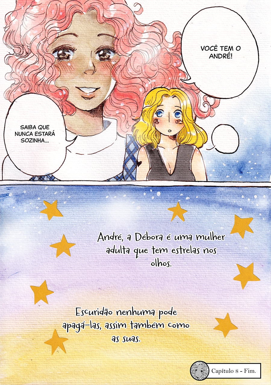 Nossa, gostei muito dessa pegada meio surrealista desse capítulo, ficou muito legal e interessante de ver e ler, além do traço lindo!♡ Gostei muuito também de como o pesadelo da Andreia foi retratado com um formato e "vibe" de livro infantil, um pesadelo traumático disfarçado de sonho inocente de criança!