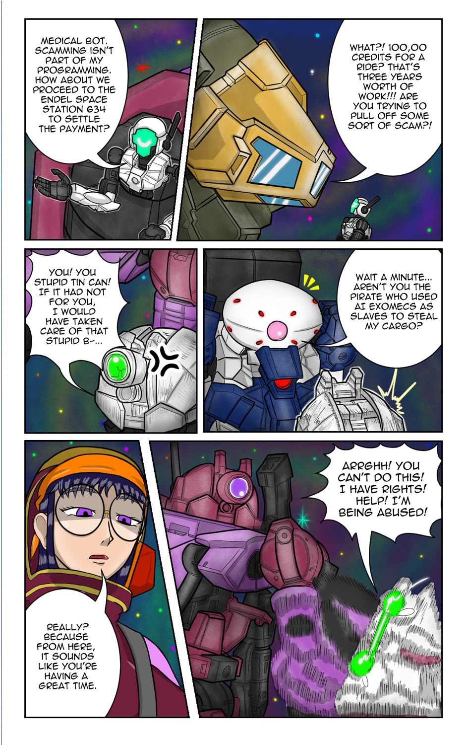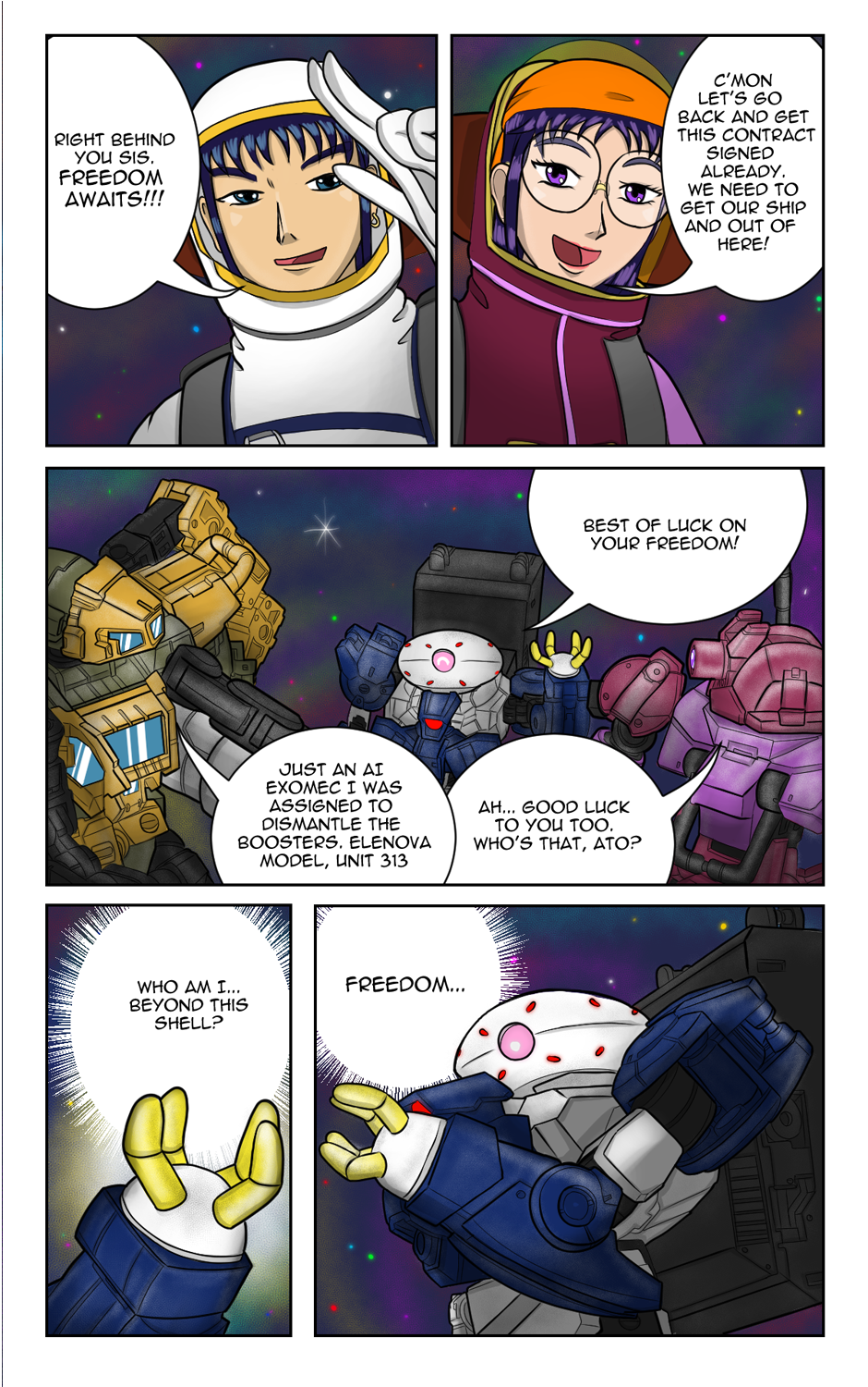 In a distant galaxy ruled by AIs, space couriers Ele and her team are entrusted with a mysterious cargo: an empty AI Transhuman body. Pursued by AI agents, Ele must fight back using her Exomec, a customizable mech for space travel. As the chase unfolds, Ele, an AI existing within an artificial body, embarks on a journey to learn humanity and fight for her newfound freedom.