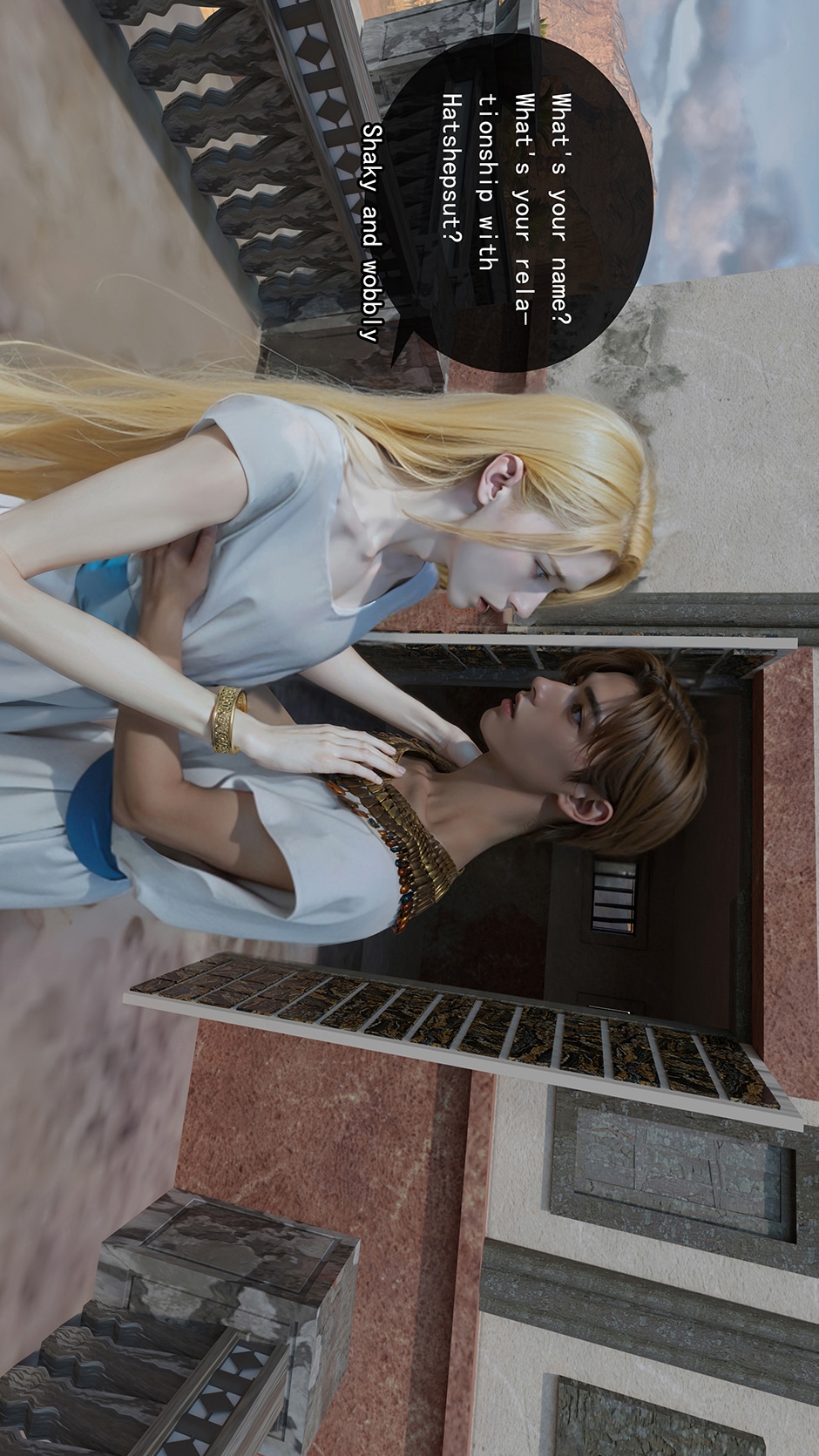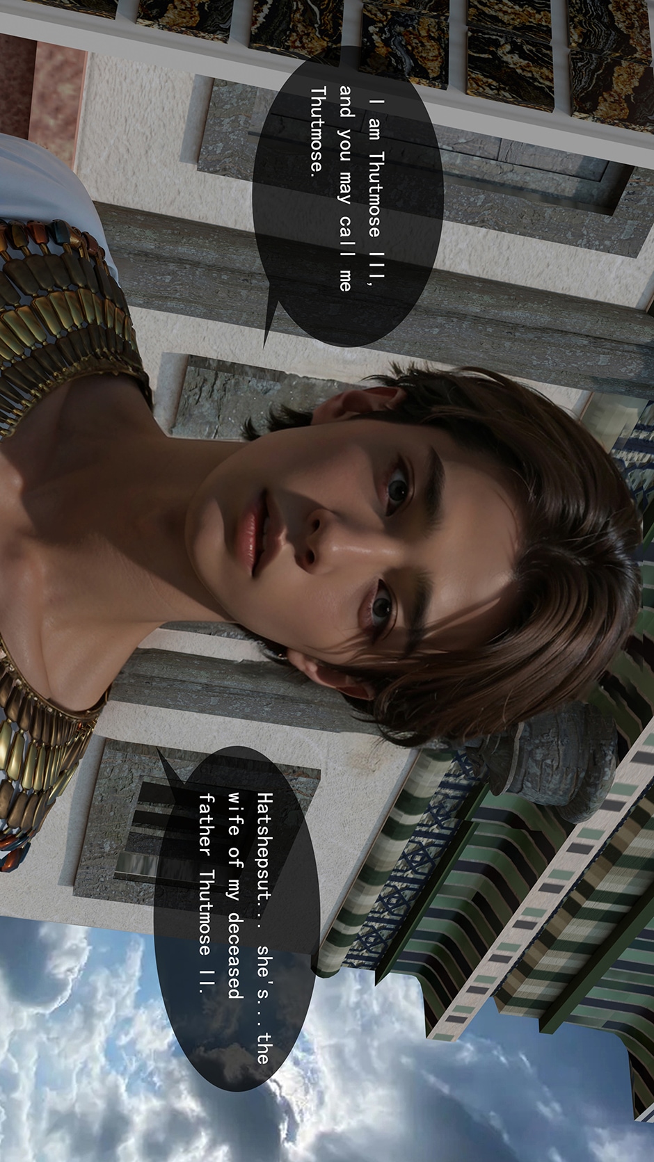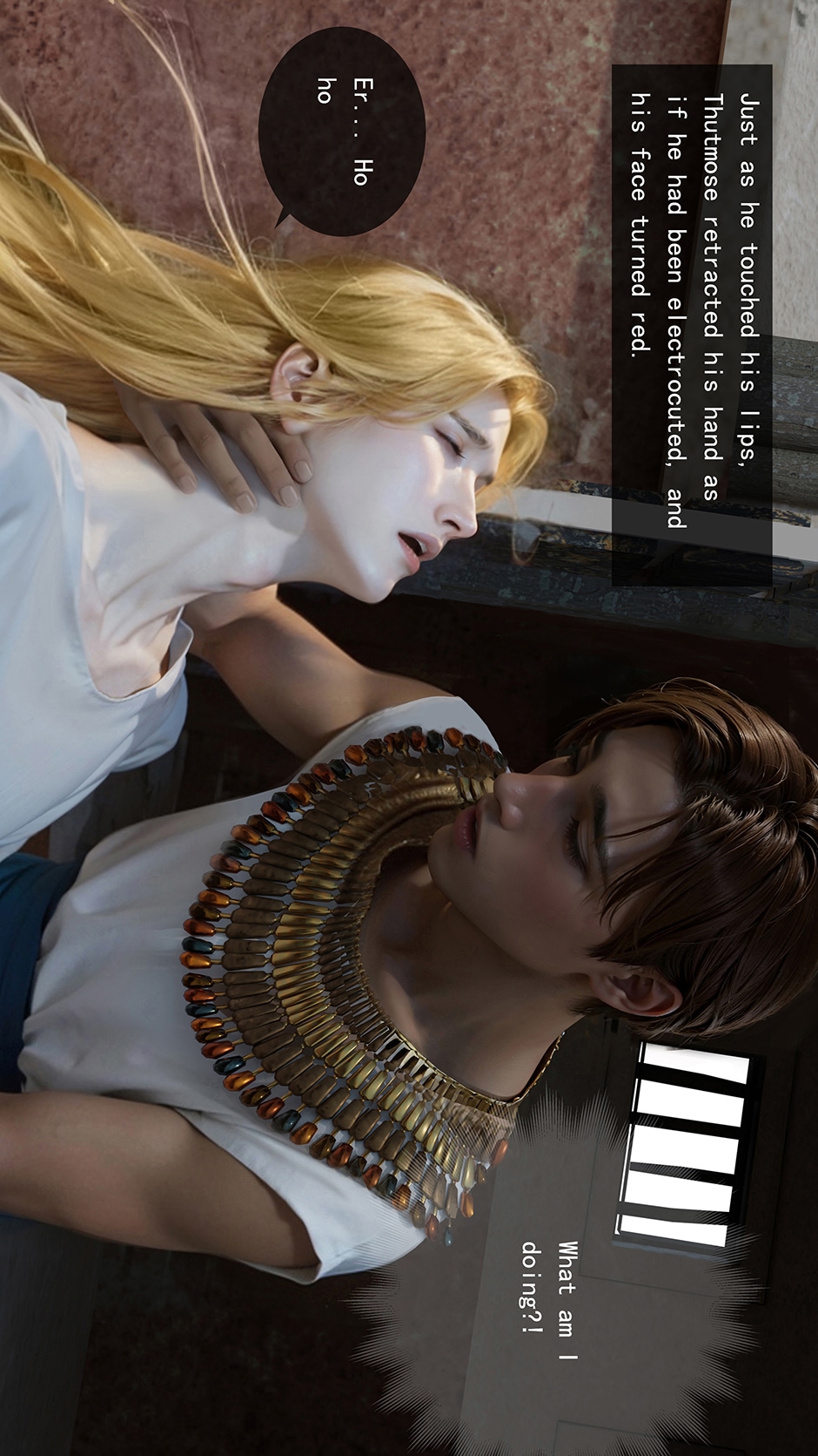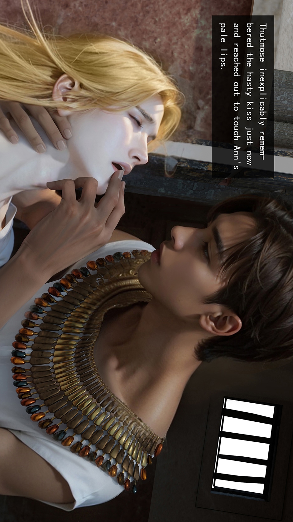 When I was young, I was infatuated by crossed back mangao, so I always want to make a BL crossed manga. The bottom is a modern man who crossed back to ancient Egypt. He is in poor health. The top is Thutmose III of the 18th dynasty in ancient Egypt. Because the story is fictional, and I am sure I will make mistakes in historical materials, so pls look it like a story in parallel time and space. This manga is made with blender+photoshop+ai. Hope you like it.