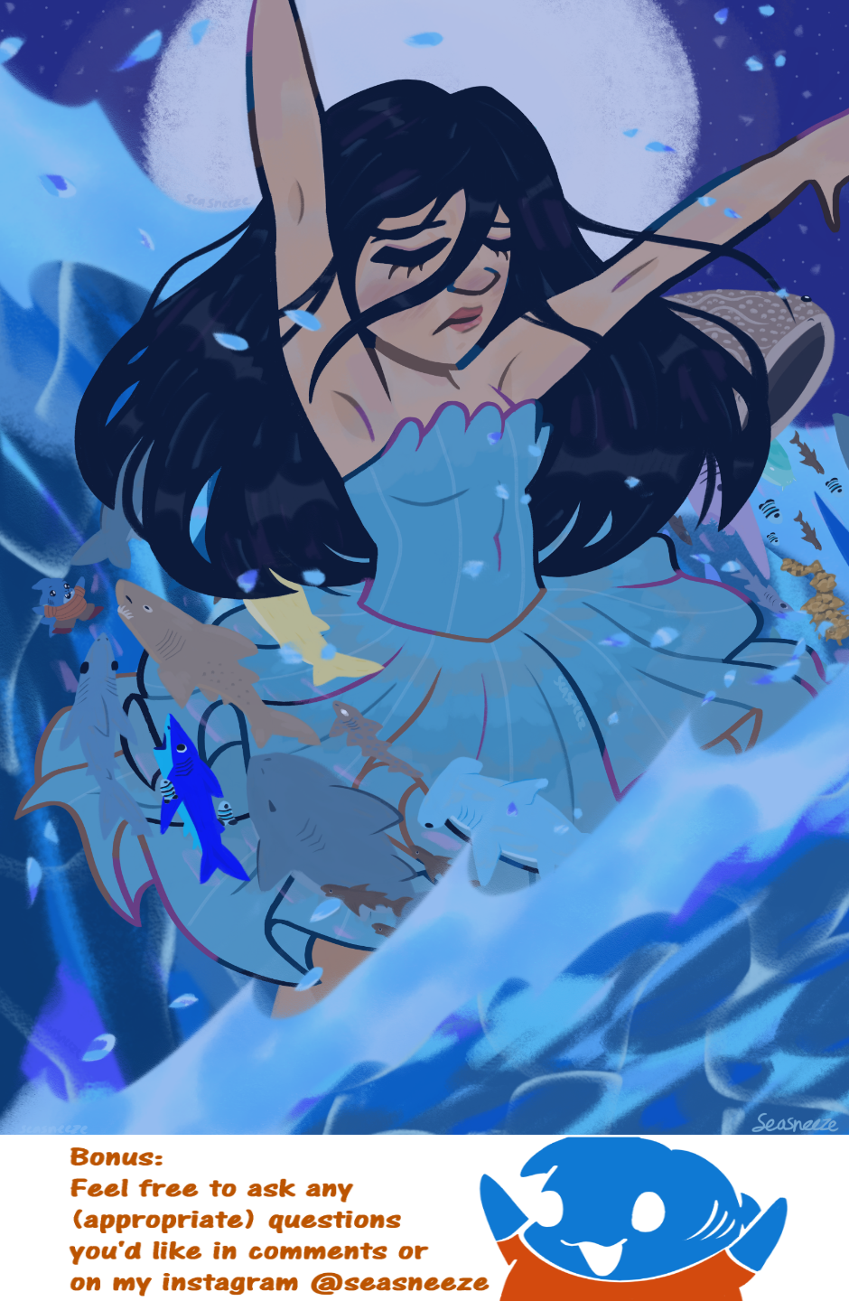 Some early concept art before I had more things/designs figured out! I think what prompted this was just wanting to draw an early version of Lian looking really beautiful and ethereal, with a bunch of sharks swarming her.