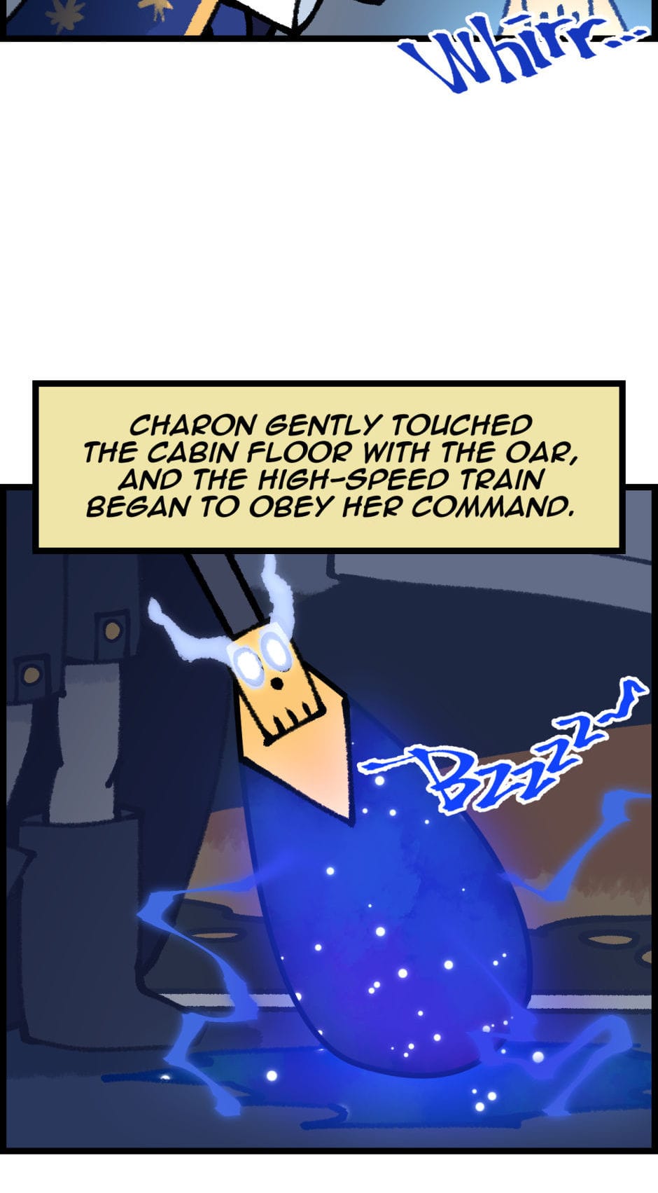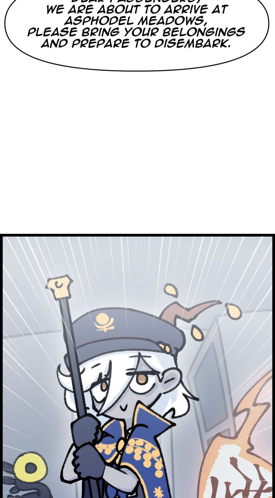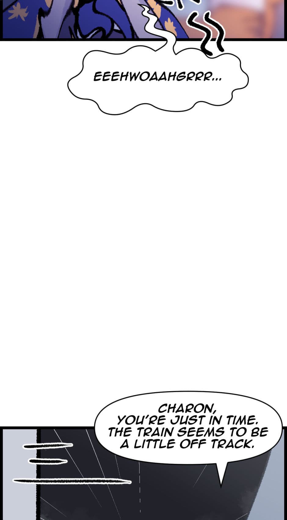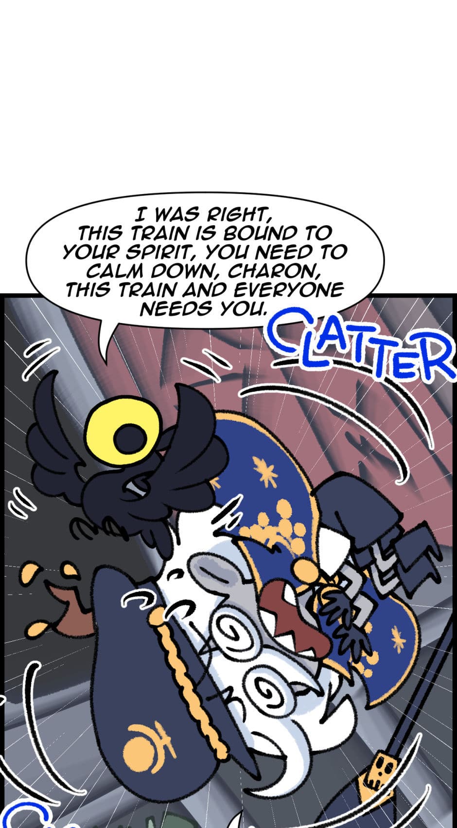 Despite her newfound status, Charon's initial foray into this modern profession is anything but smooth. Her first major misstep occurs when she, overwhelmed by her own anxiety and unfamiliarity with the role, delivers a series of harsh and cruel remarks to the passengers. Her words incite fear and anger among the souls onboard, leading to a chaotic revolt that nearly derails the train and sends it spiraling into chaos.