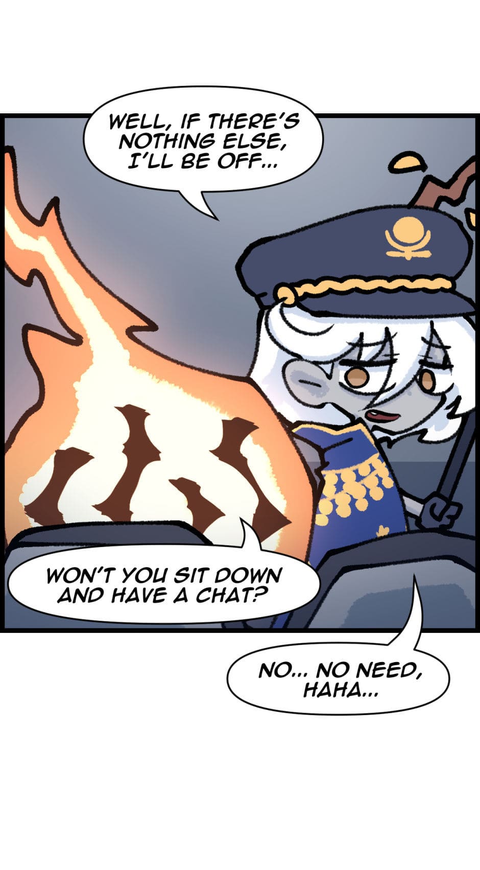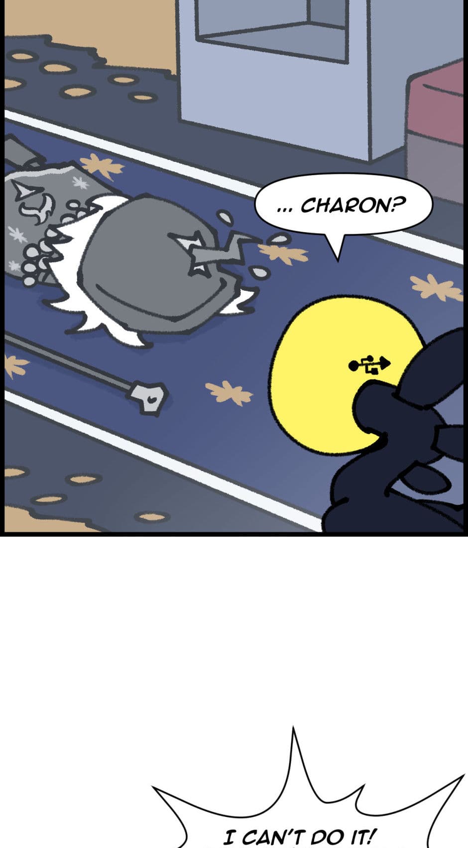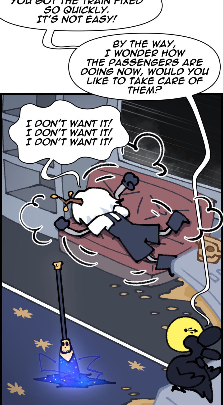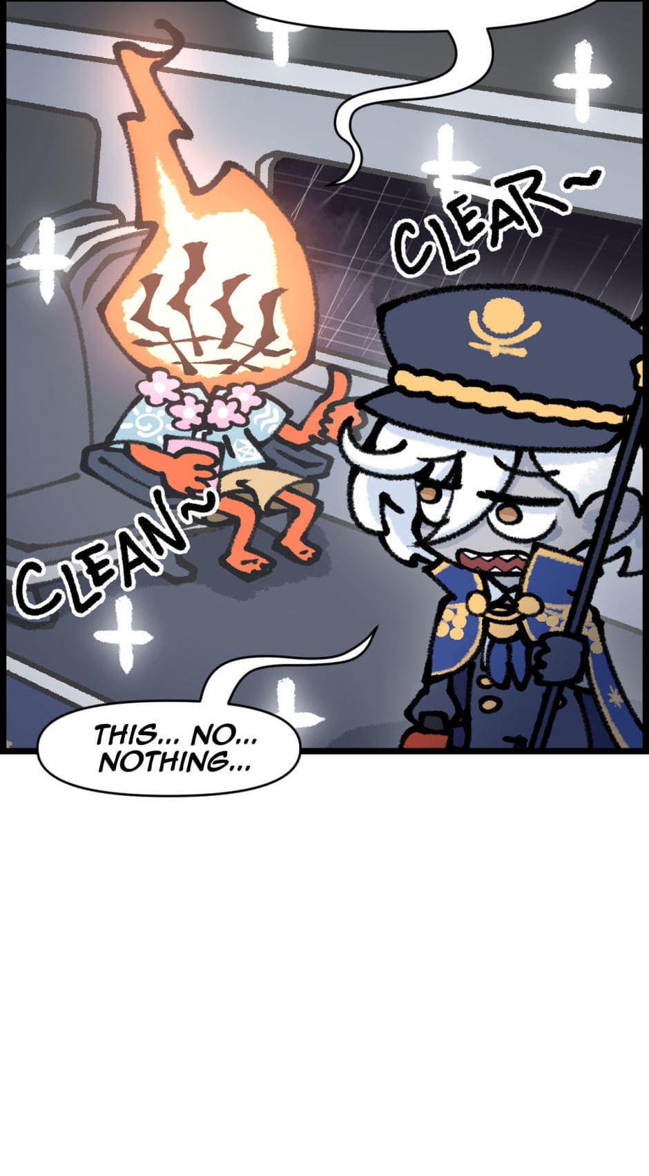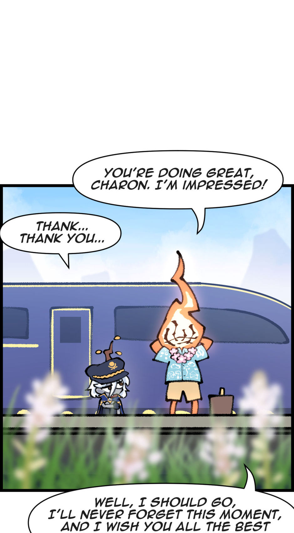 Despite her newfound status, Charon's initial foray into this modern profession is anything but smooth. Her first major misstep occurs when she, overwhelmed by her own anxiety and unfamiliarity with the role, delivers a series of harsh and cruel remarks to the passengers. Her words incite fear and anger among the souls onboard, leading to a chaotic revolt that nearly derails the train and sends it spiraling into chaos.