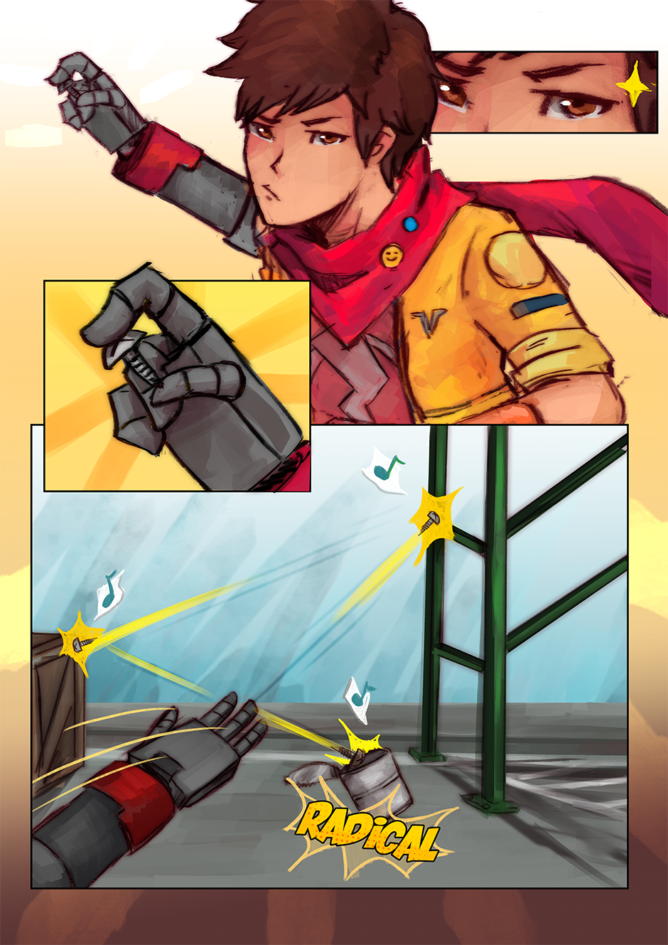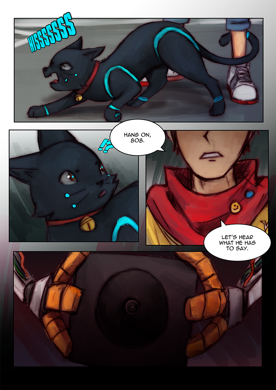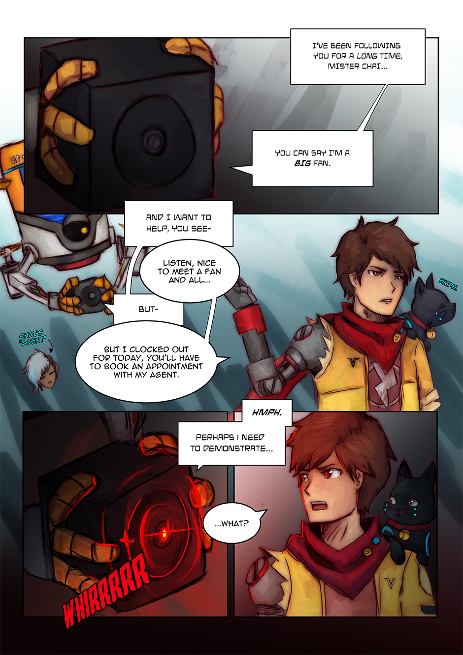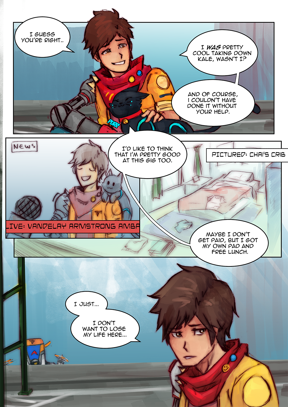 I had actually reused an older drawing I did (an art piece I did for the Hi-Fi Rush TGA annoucements) as one of the panels. Fun Fact: I've also taken the interpretation that Chai can kind of 'talk' to 808, but that no one else can really understand her 'words', Chai just can because they're synchronized. I love them as a duo, so having a chapter with (mostly) just them was fun to do.