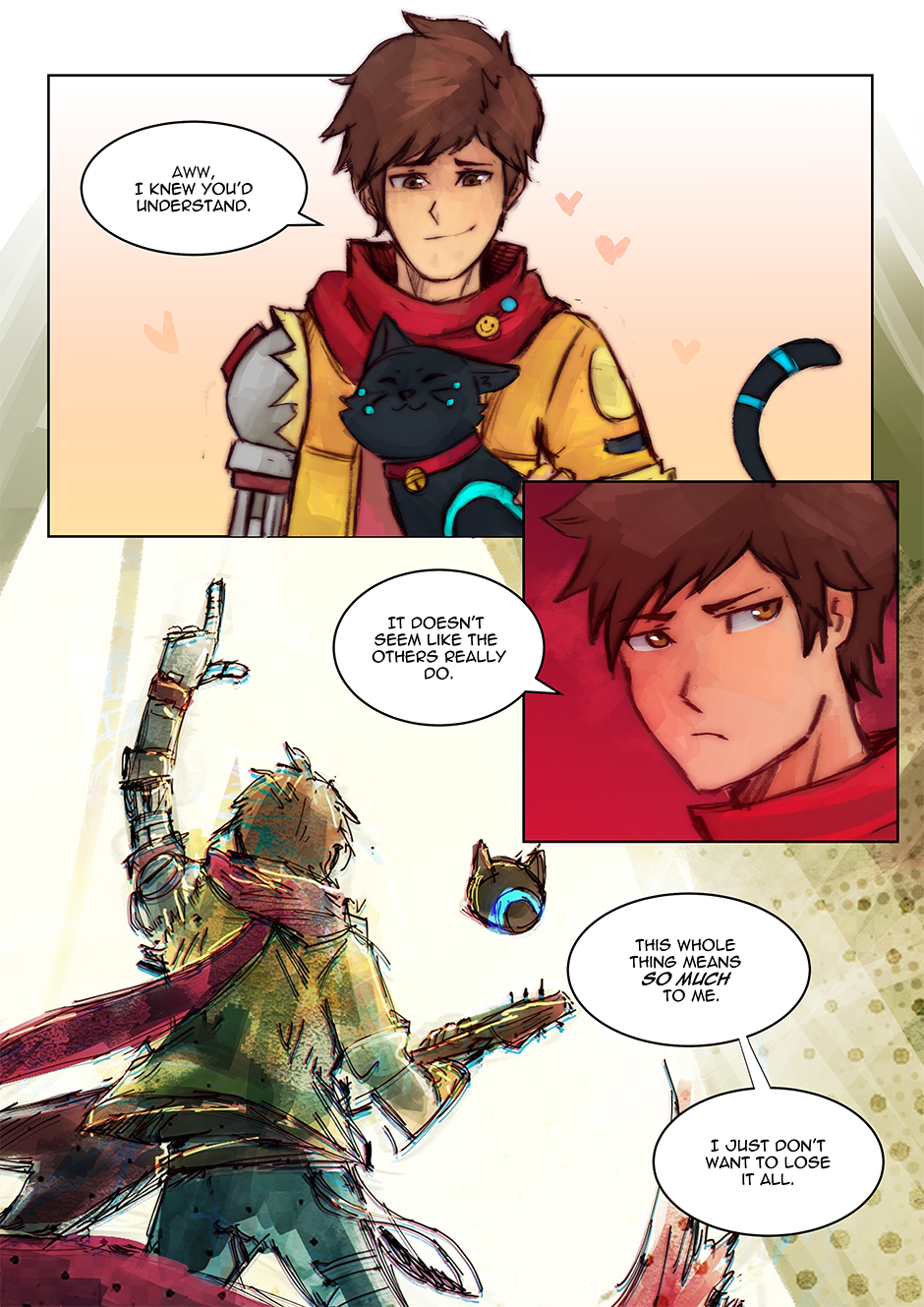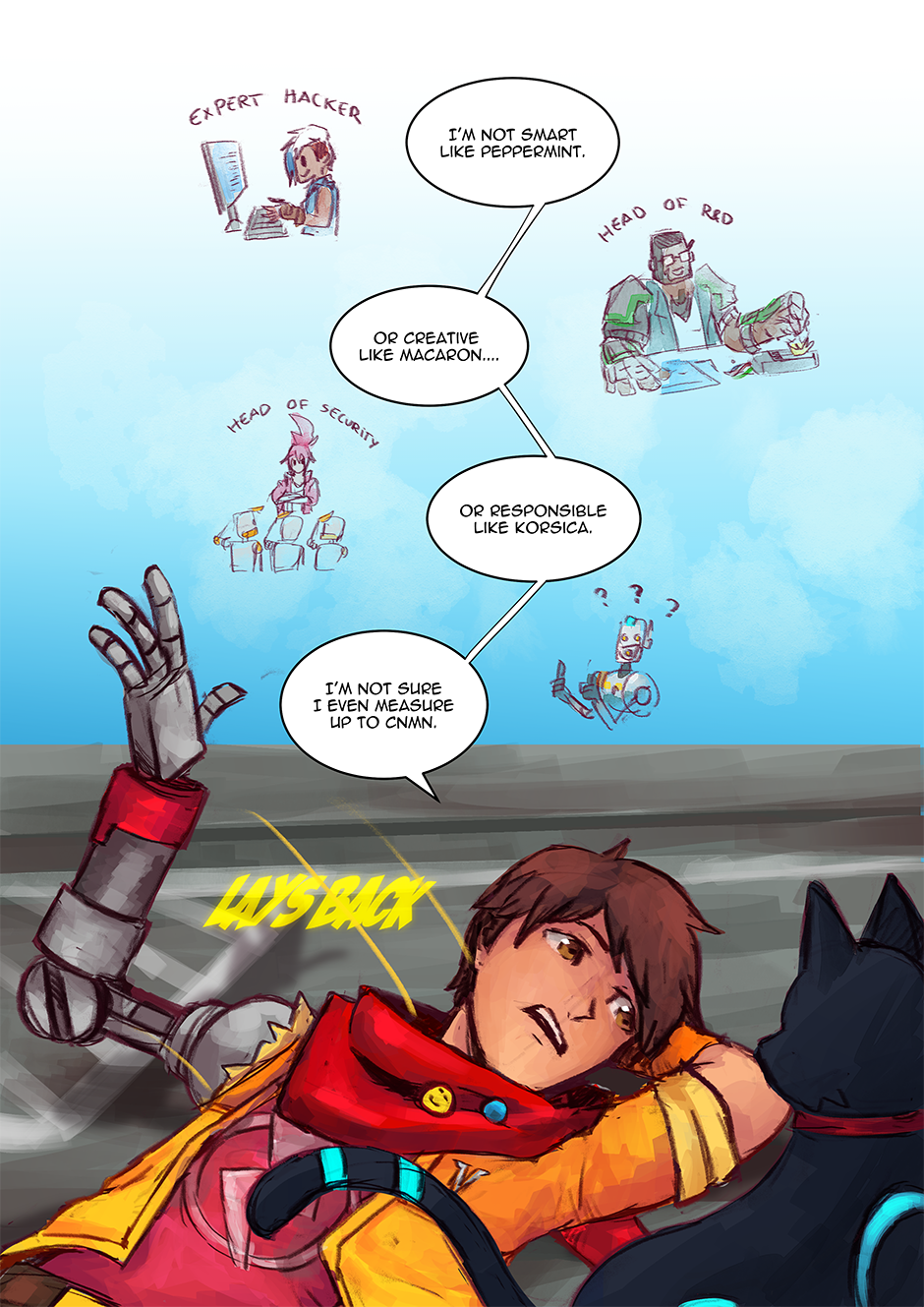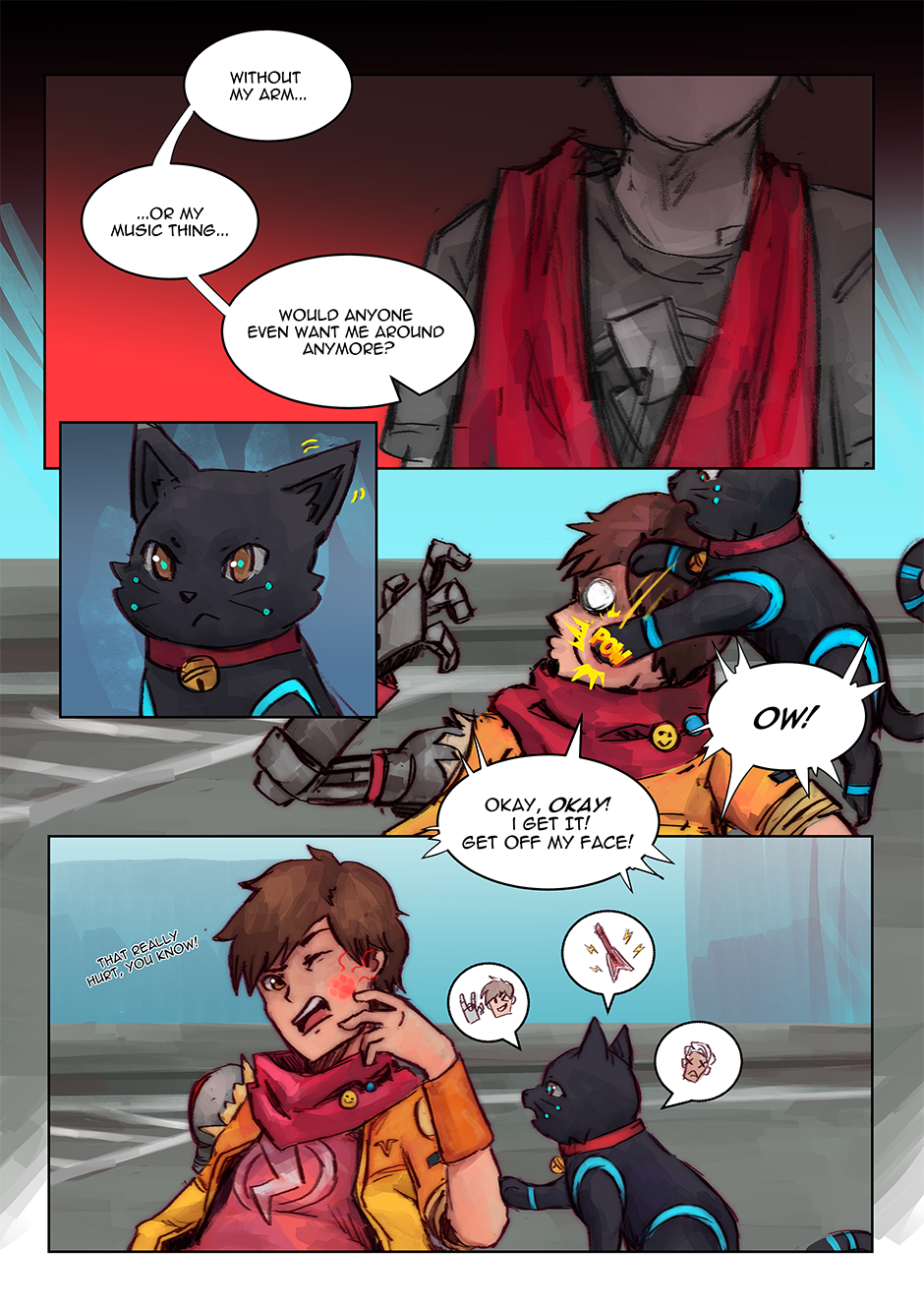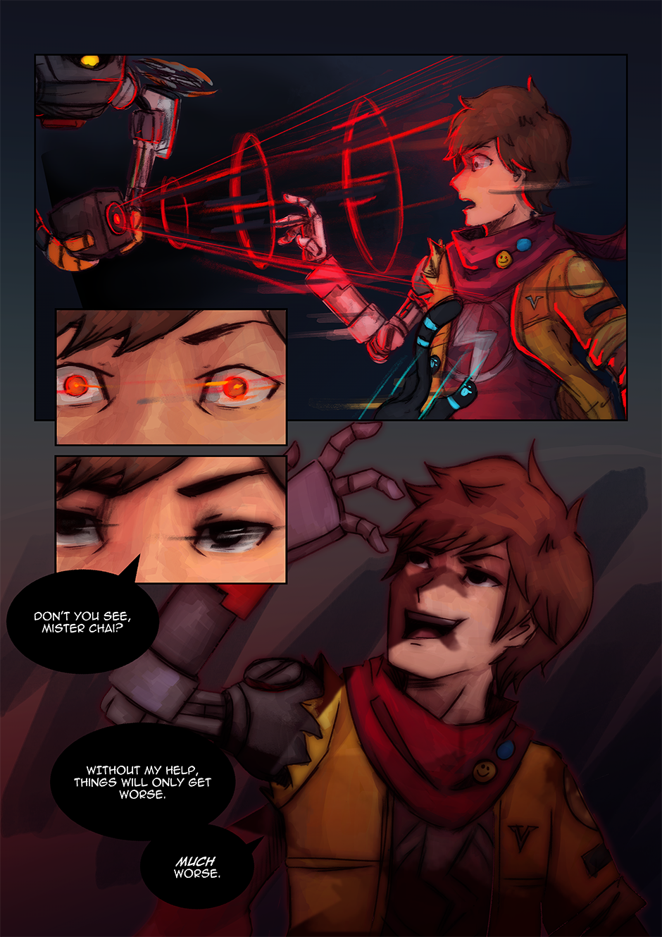 I had actually reused an older drawing I did (an art piece I did for the Hi-Fi Rush TGA annoucements) as one of the panels. Fun Fact: I've also taken the interpretation that Chai can kind of 'talk' to 808, but that no one else can really understand her 'words', Chai just can because they're synchronized. I love them as a duo, so having a chapter with (mostly) just them was fun to do.