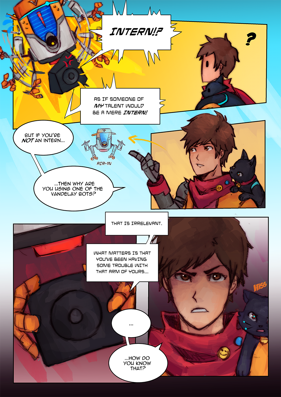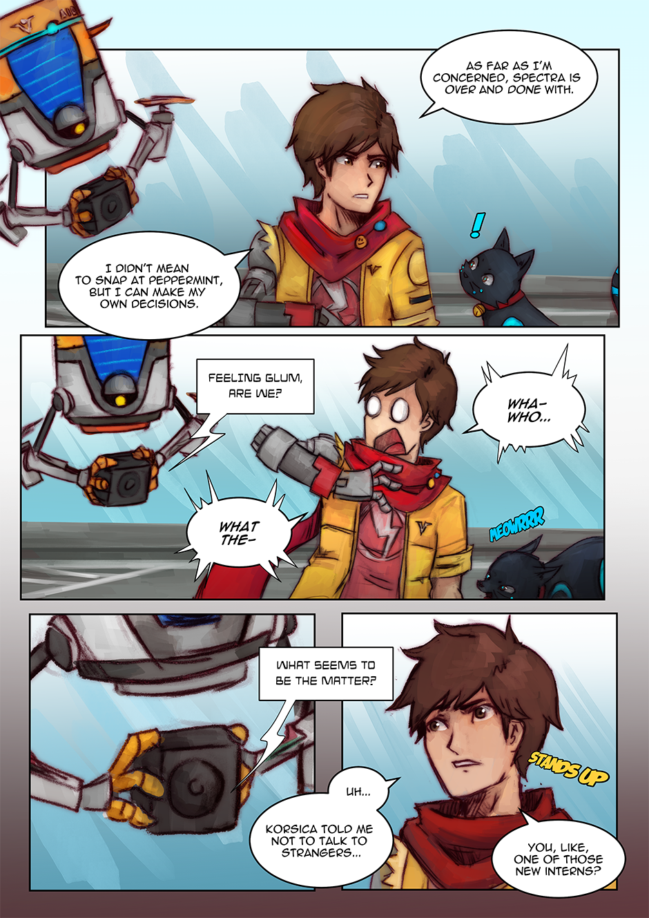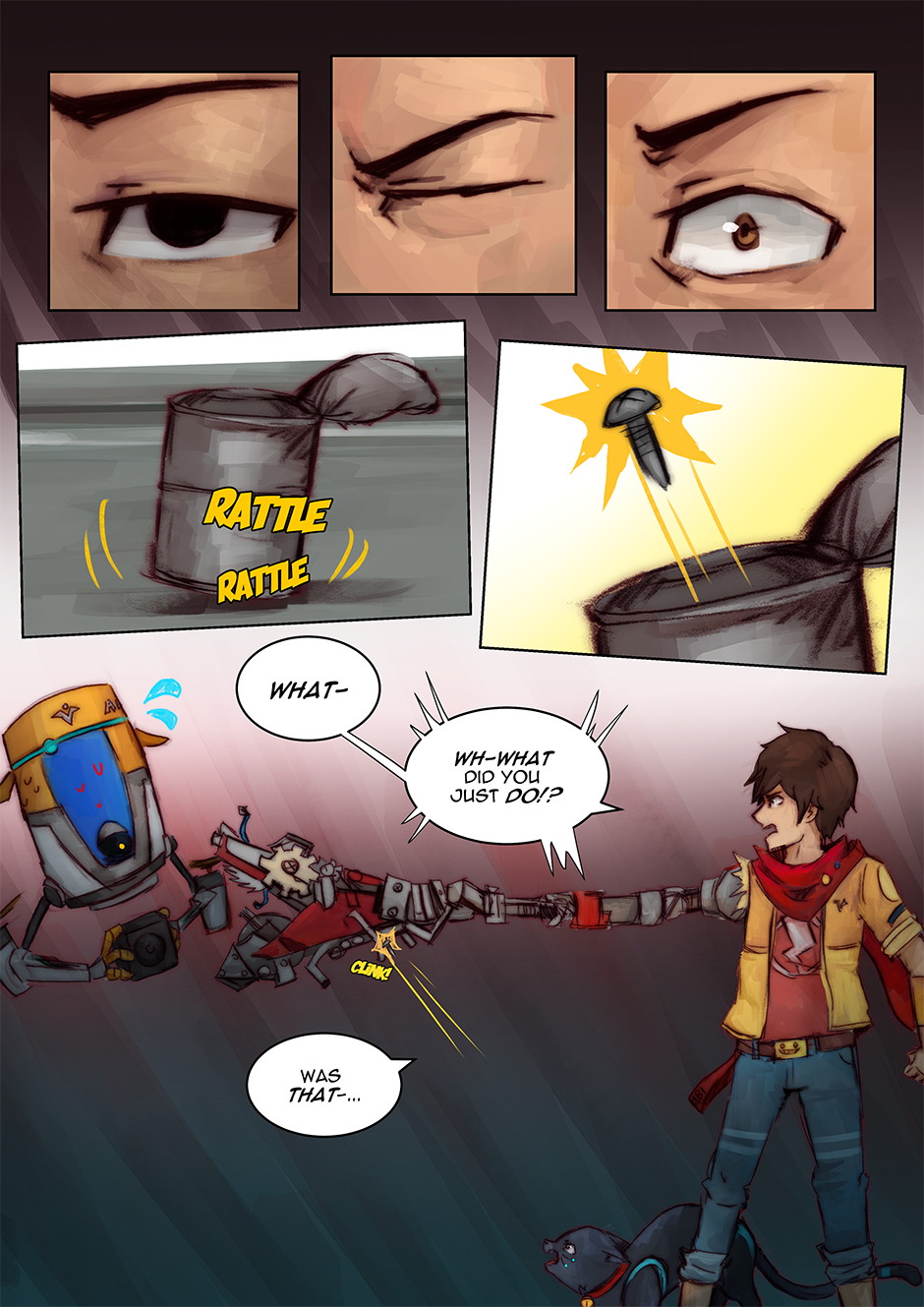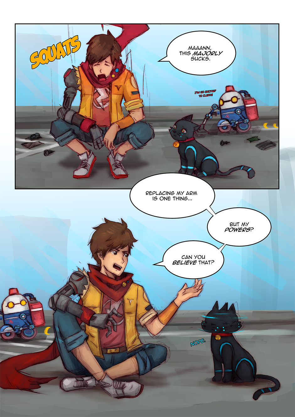 I had actually reused an older drawing I did (an art piece I did for the Hi-Fi Rush TGA annoucements) as one of the panels. Fun Fact: I've also taken the interpretation that Chai can kind of 'talk' to 808, but that no one else can really understand her 'words', Chai just can because they're synchronized. I love them as a duo, so having a chapter with (mostly) just them was fun to do.