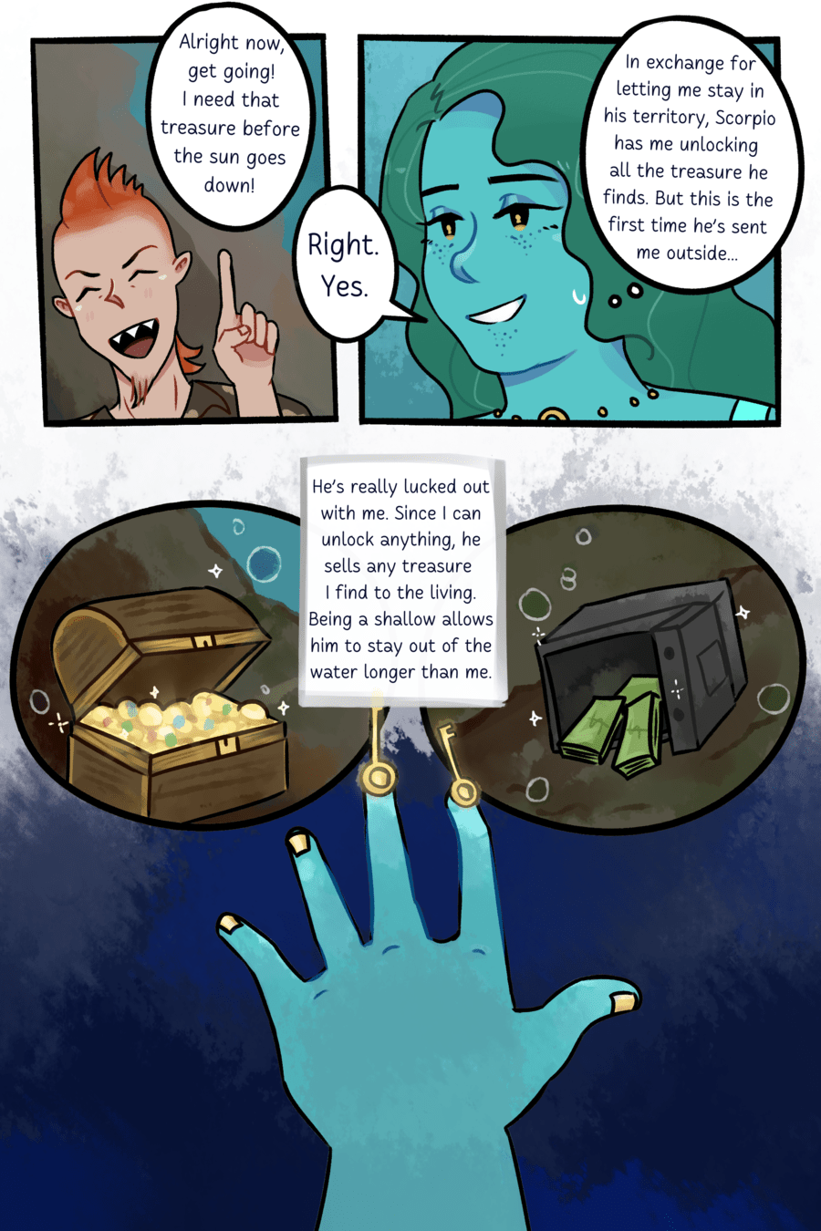 After falling off of a cruise ship to her death, Martina has forgotten almost everything except her name and her lover who she shares matching key & lock necklaces with. The sentimental attachment to her necklace has granted her unique powers in the afterlife—she can unlock anything. It's useful for finding sunken treasure, but in order to feel at peace she must find her lover again to say goodbye. Will Martina find the ship they were on before she met her demise? How did she fall to begin with?