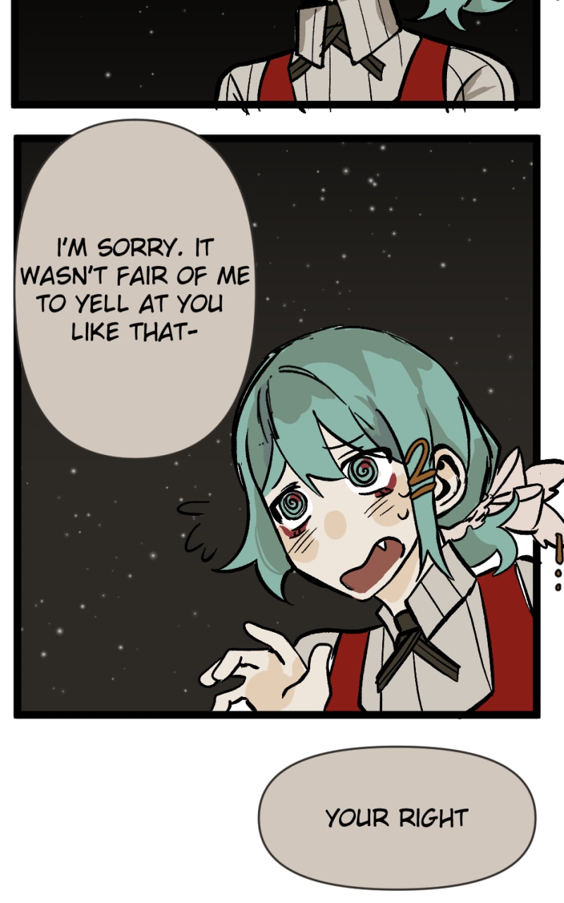 So excited to see it finished! This is amazing, and I'm glad to see Dante finally own up to his mistakes. Love how you made your characters come to life, their interactions feel real and you did a wonderful job. Youre already an amazing comic creater, and you'll be even better in the future. Thanks for writing!