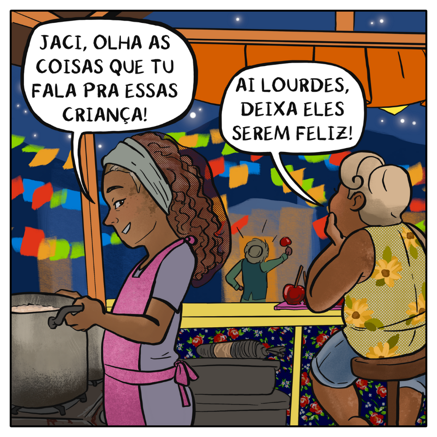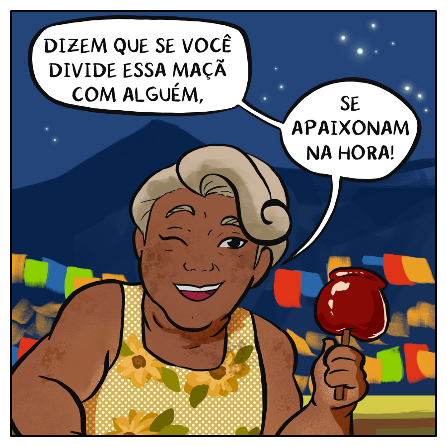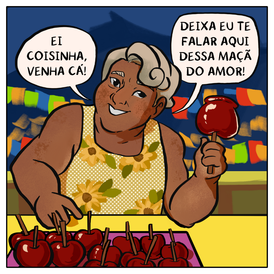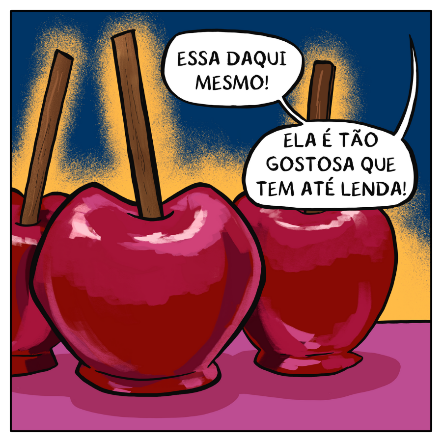 Essa história que a Jaci contou é uma coisa que eu ouvi há muitos anos, quando uma amiga da minha rua disse que quem comia maçã do amor se apaixonava, e eu, como uma boa criança antirromântica, não comi maçã por anos, até eu desencanar dessa história e do medo de me apaixonar