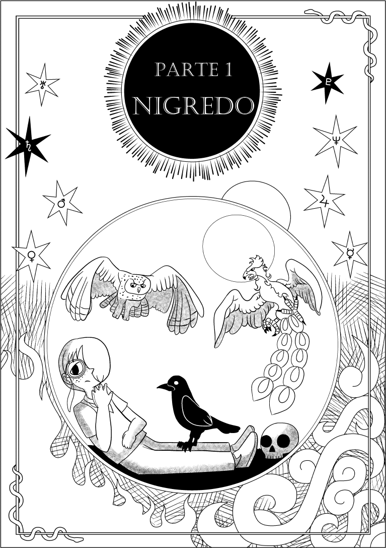A capa é uma referência a uma das imagens mais famosas que representam o nigredo, que é o alquimista em um balão sendo aquecido, com sua alma deixando o corpo e um corvo (o pássaro que representa o nigredo) sobre a barriga dele. Alguns elementos aqui são decorativos, outros estão ligados a situações futuras do capítulo. Divirtam-se. ;)