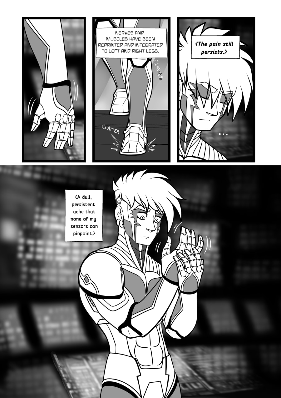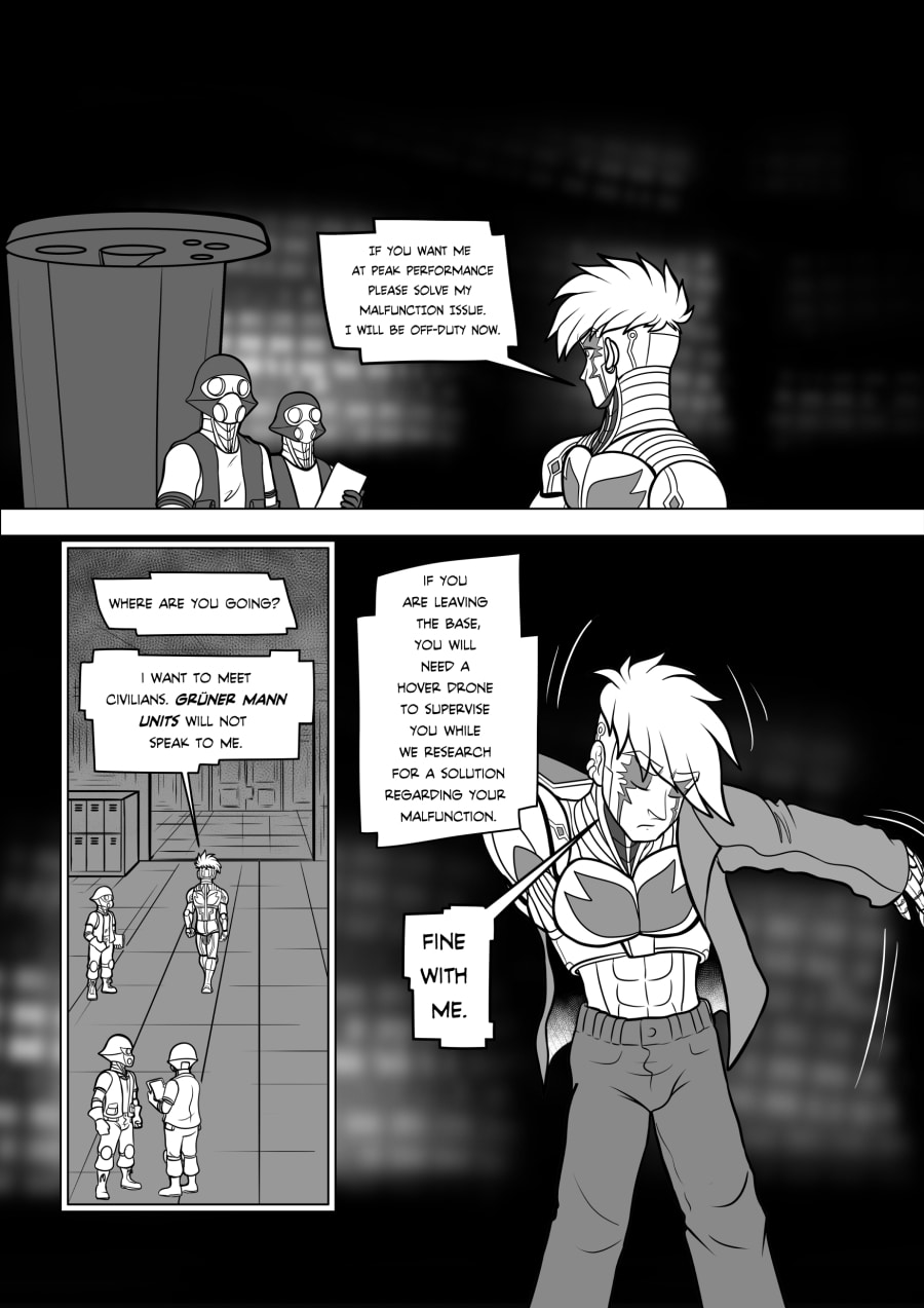 Crisanto is a cyborg soldier created to defend a newly stablished off-world colony. However, more than battles he yearns of companionship, concept that in his world is not embraced. Then he meets Brant, a cyborg who has just arrived from a scouting mission on Earth, and recently got transferred to the same base he is in. They get to know each other and their relationship develops.