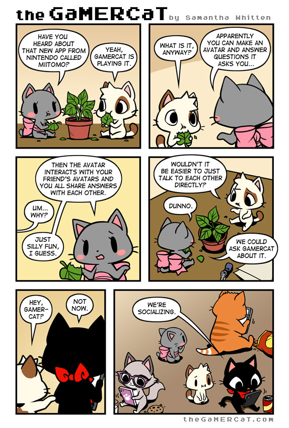 What better way to interact with your friends than to poke at your phone instead? Side note, it's nearly impossible to have house plants with cats around. Game: Miitomo