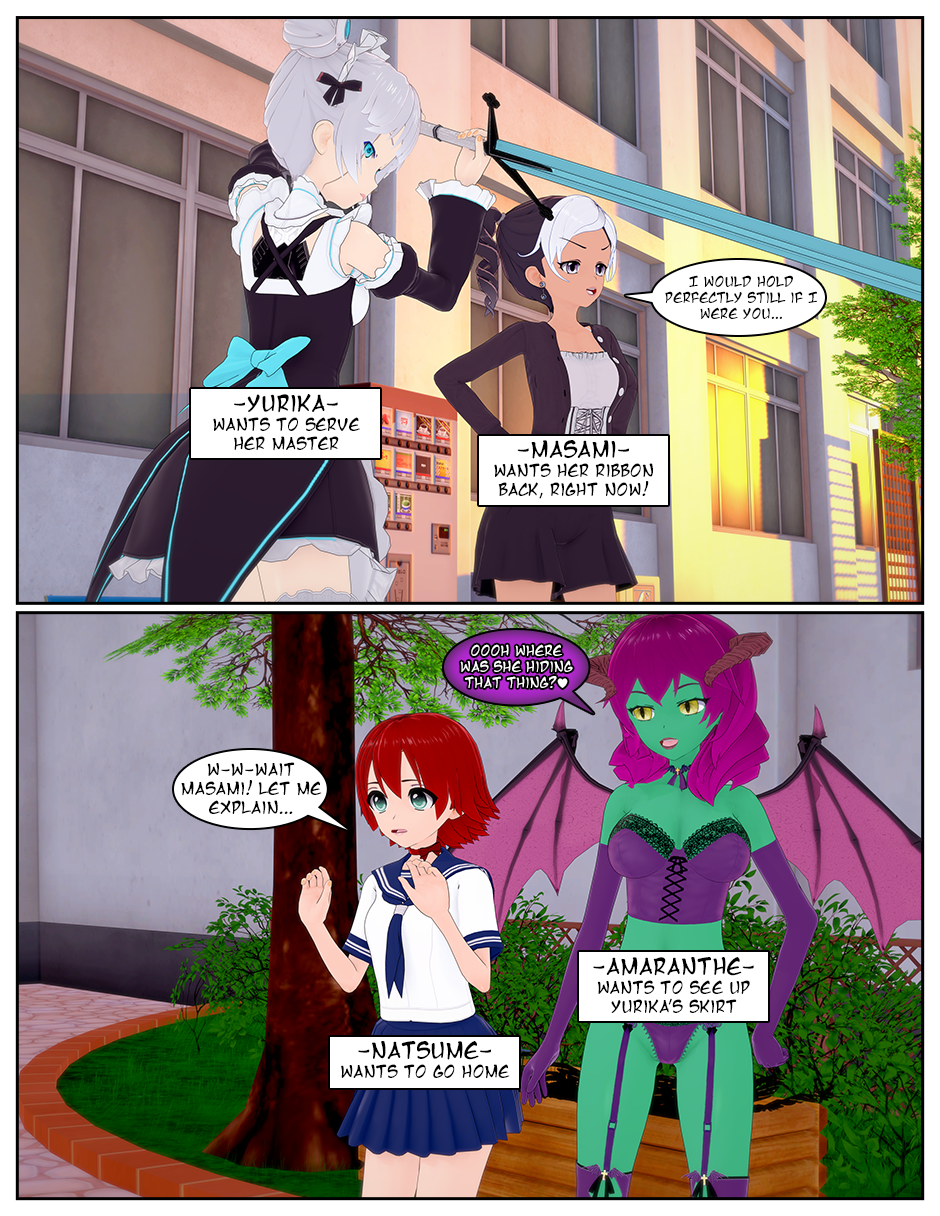 One day, she finds a red ribbon, and decides to put it on, in the hopes of making herself stand out a bit more. What she didn’t know was that the ribbon was enchanted to summon an impulsive succubus name Amaranthe, who, through the power of the ribbon, is stuck on earth until she helps Natsume become more popular. With Natsume’s former best friend Masami’s help, the three of them are now on a romance-filled quest to win the hearts of their fellow classmates, complete with devious bullies, prideful angels, evil succubi, and a robot maid.