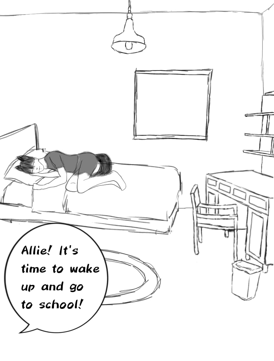 A short comic about Allie, a wolf boy, that goes to school with humans. Allie is trying to hide his identity by wearing long shirts to cover the slight bulge on his behind –which happen to be his tail that he's hiding inside his pants– and a hat, to cover his ears of course.