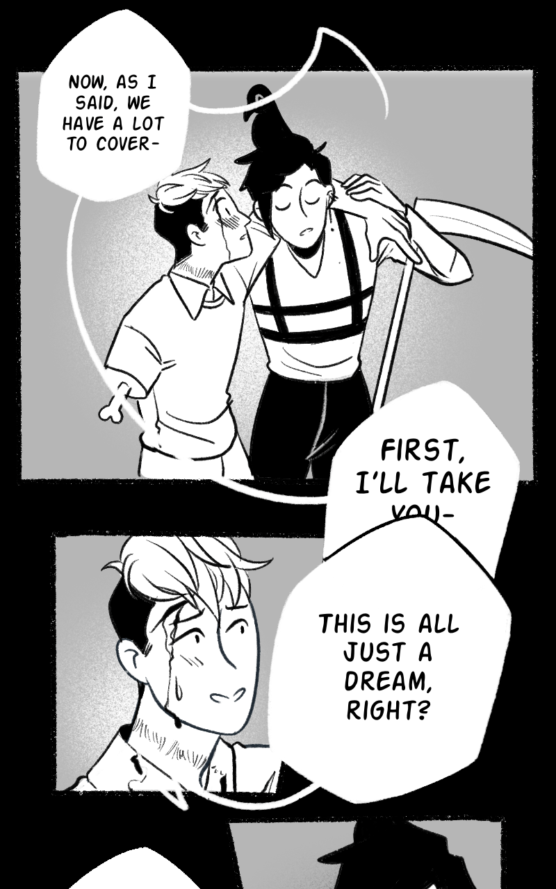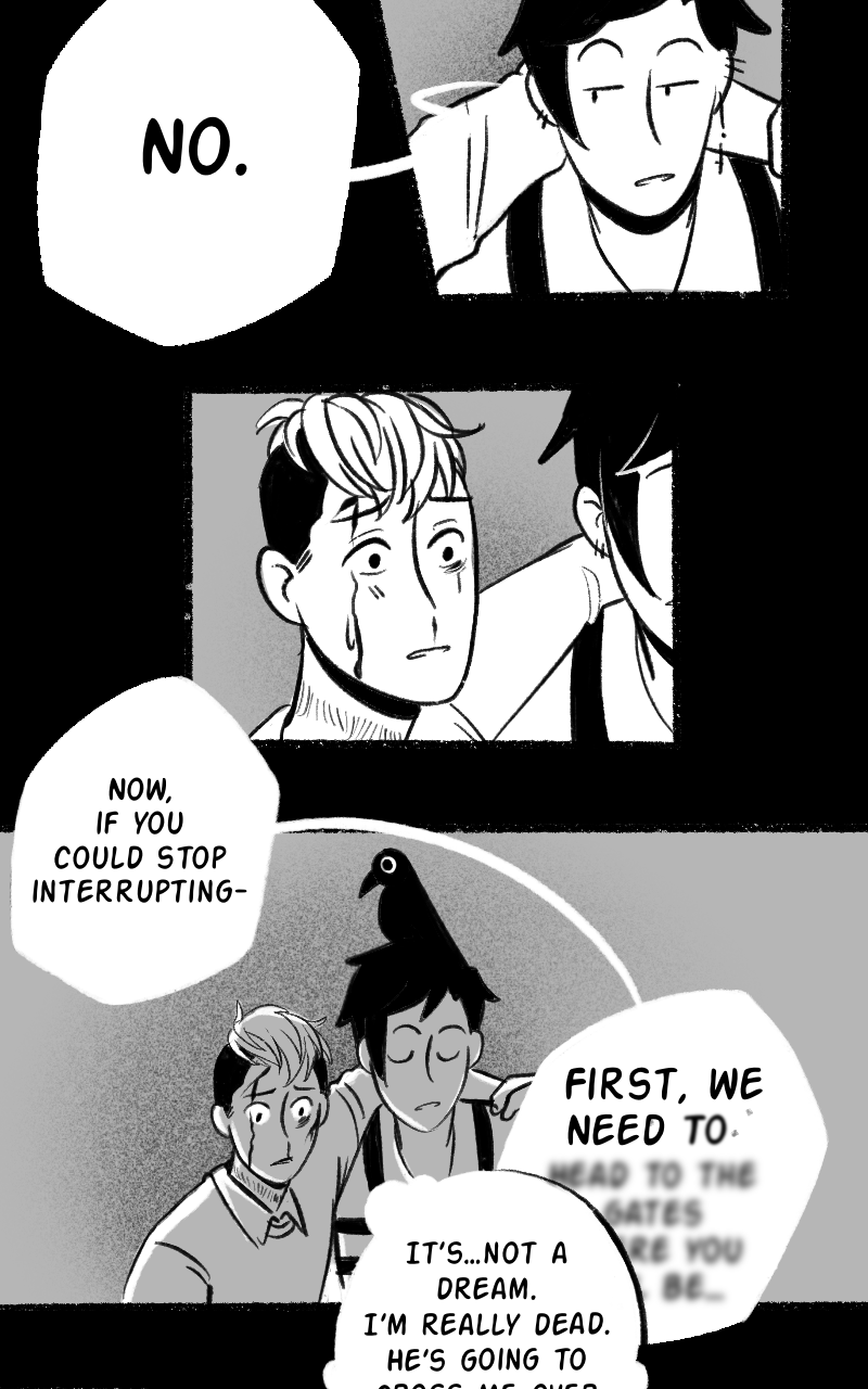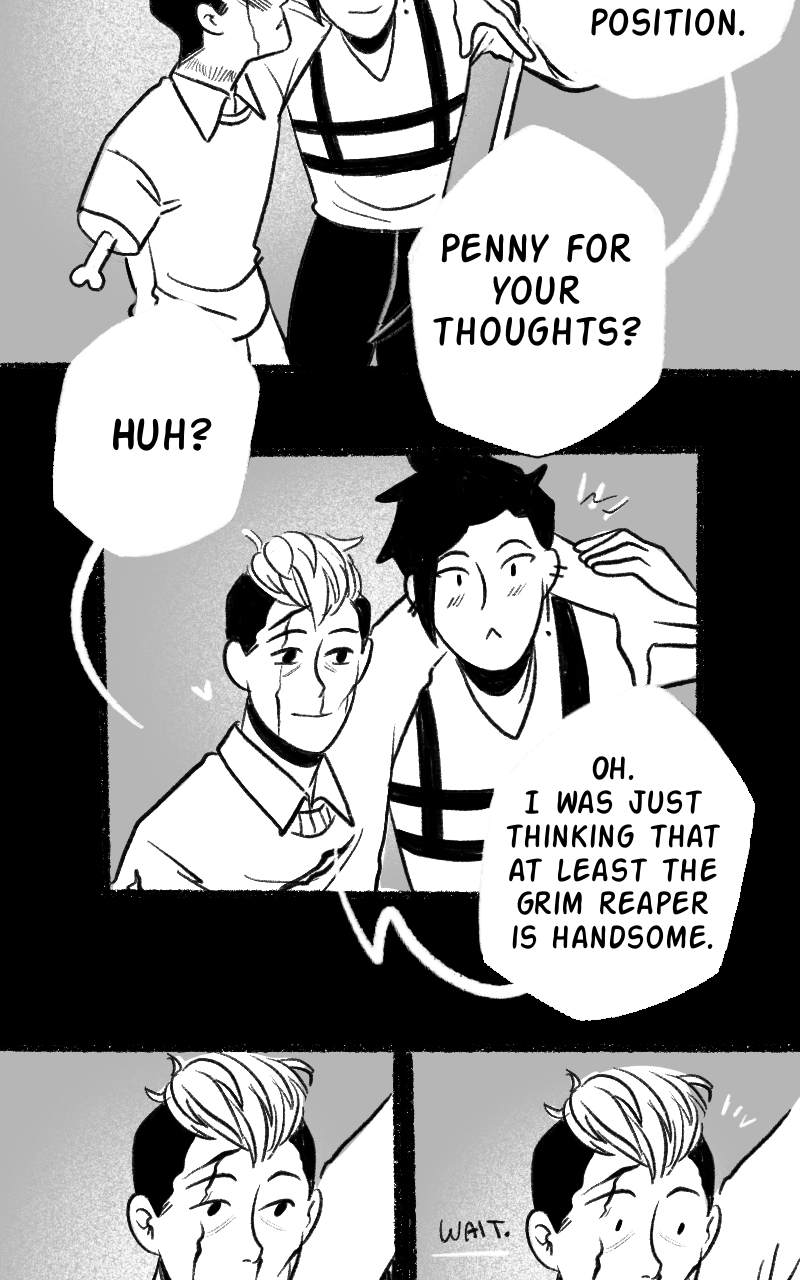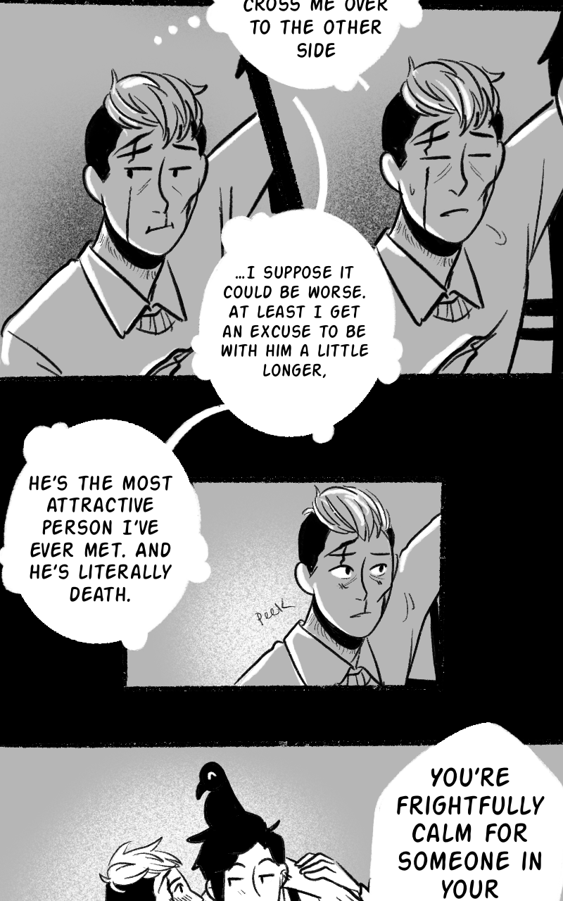 That lil raven is so precious! Is it possibly omniscient? That lil expression at the end! Awww! ♡ It's like 'I see what's going on here, hehe'. Such cuteness! Annnd Dead Boy Cole is making Grim blush already! 👀 What a fine update. Thank you! 😌✨️
