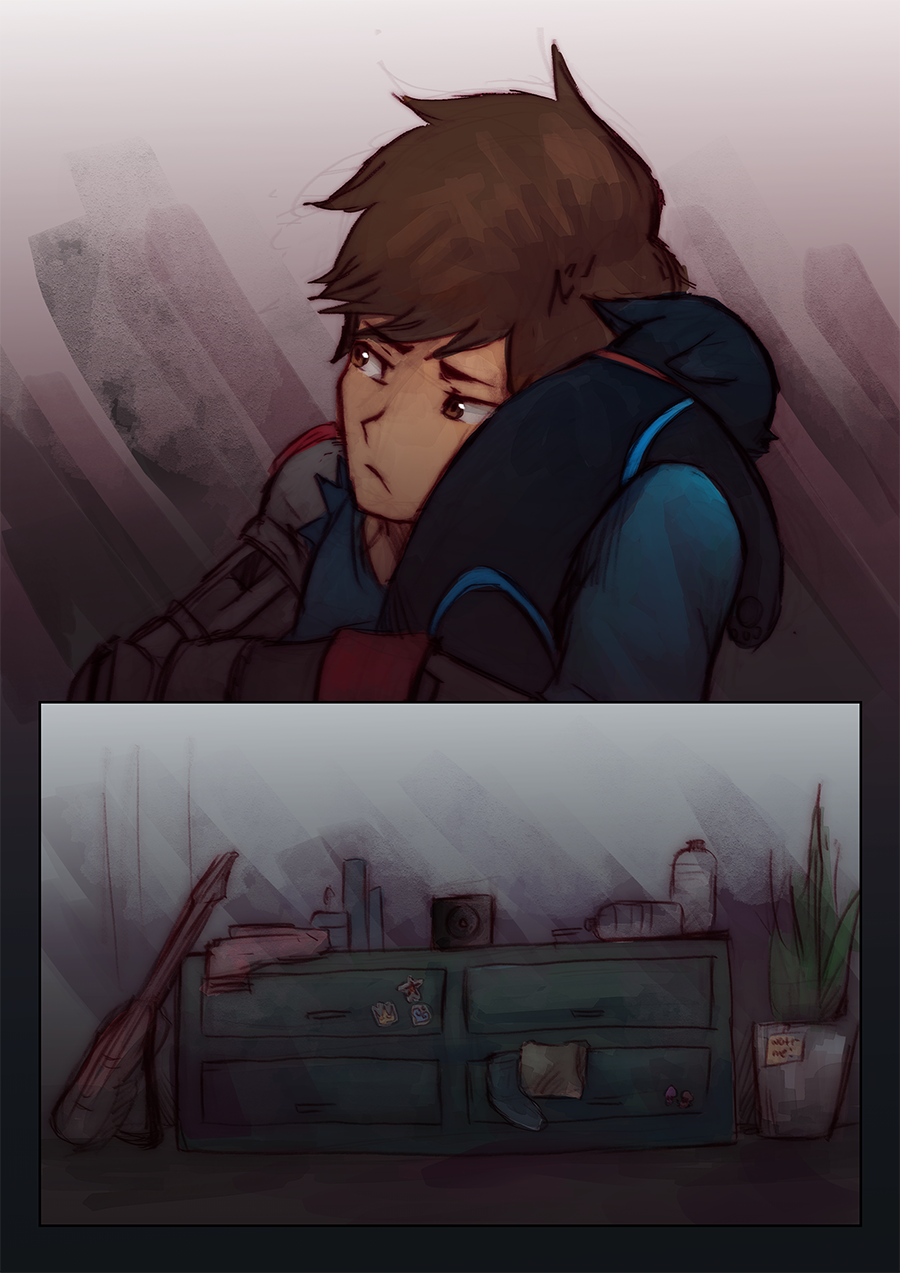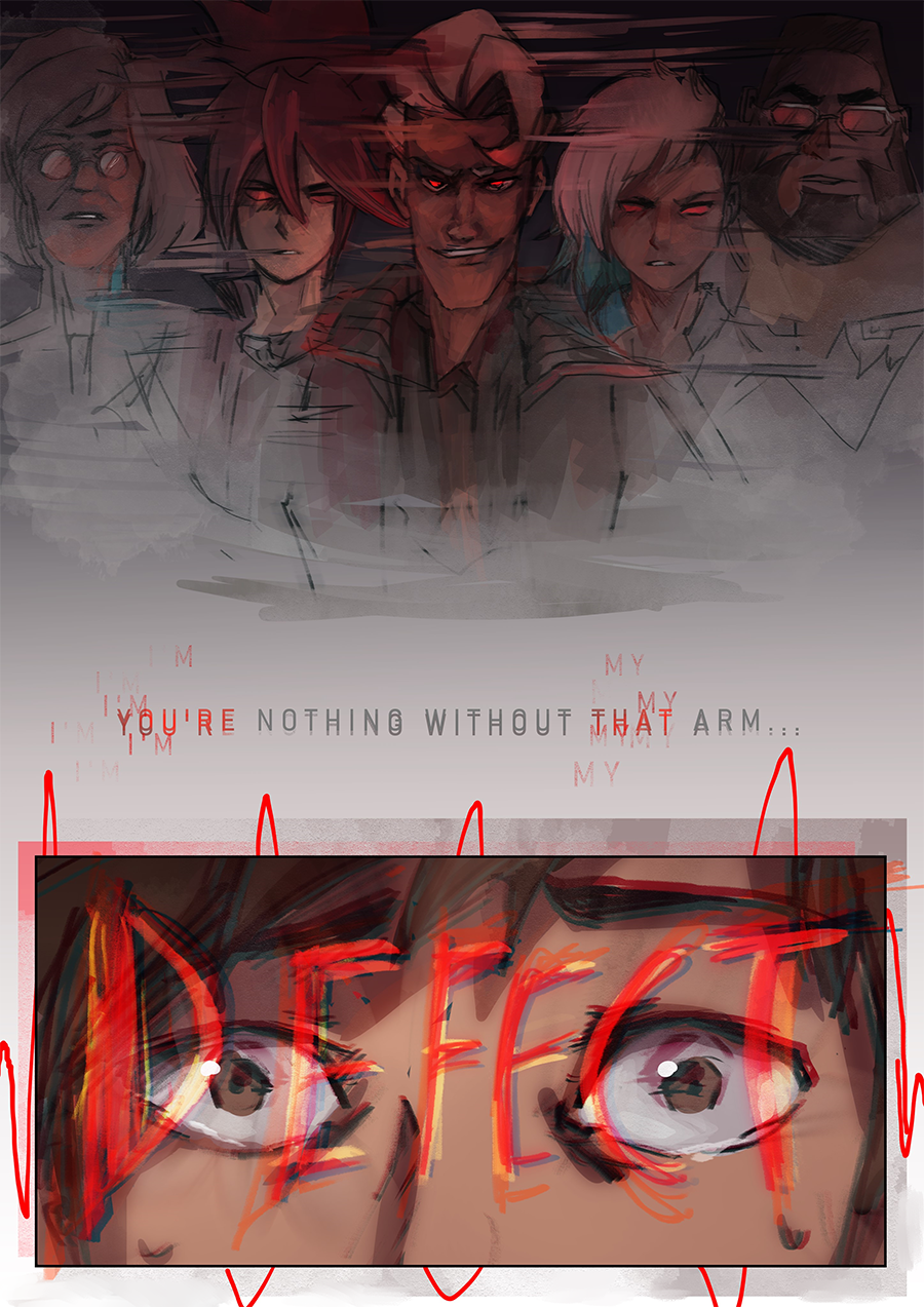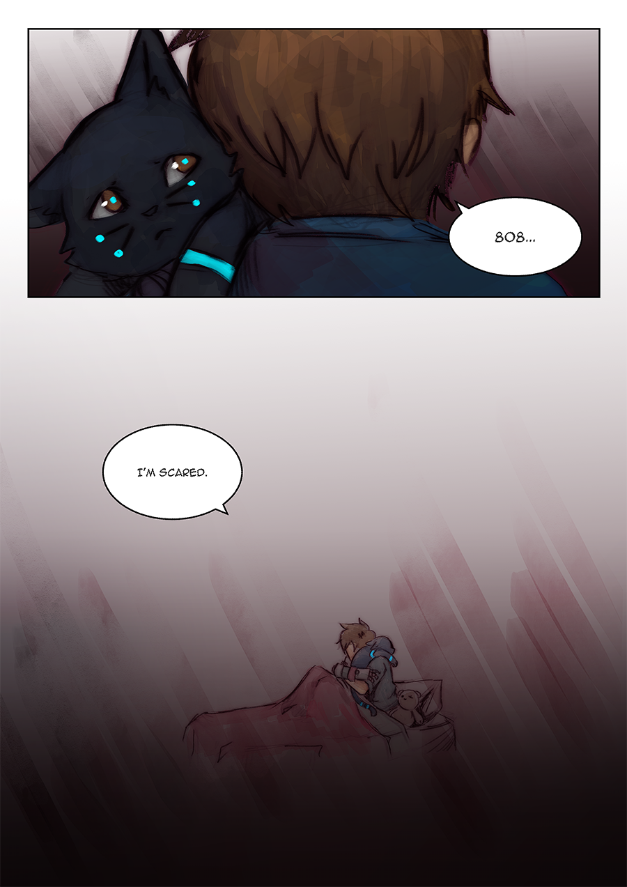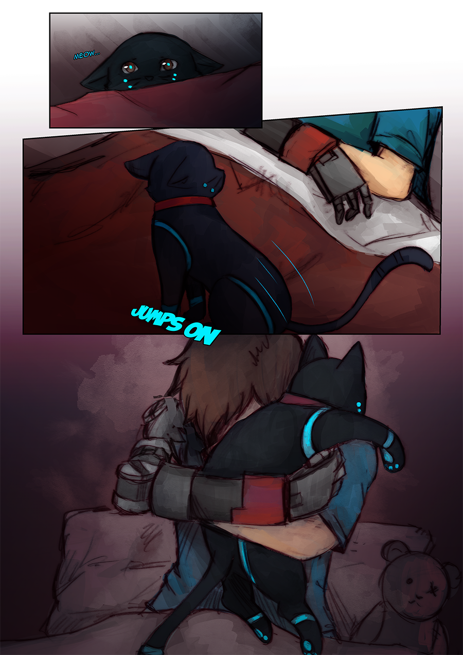 Part of the pages here were part of a short four-page mini comic that I had made a long while ago called 'Bad Dreams'. I didn't feel like posting it at the time because I felt as though it was missing something. But after I started Firmware Update, I repurposed these pages to help convey the emotions Chai is feeling at this moment. The young Chai is based on some old sketches of young Chai I did a while back and on the interpretation that Chai has been disabled since he was born. Also, originally, CNMN was going to be part of that dream sequence, but I felt that the scene might a bit too silly, so I replaced him with Roxanne xD